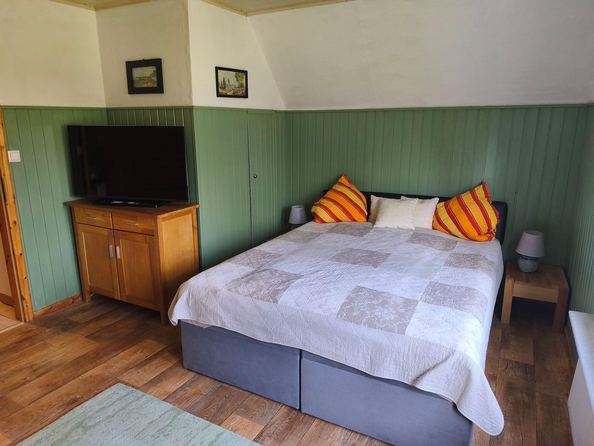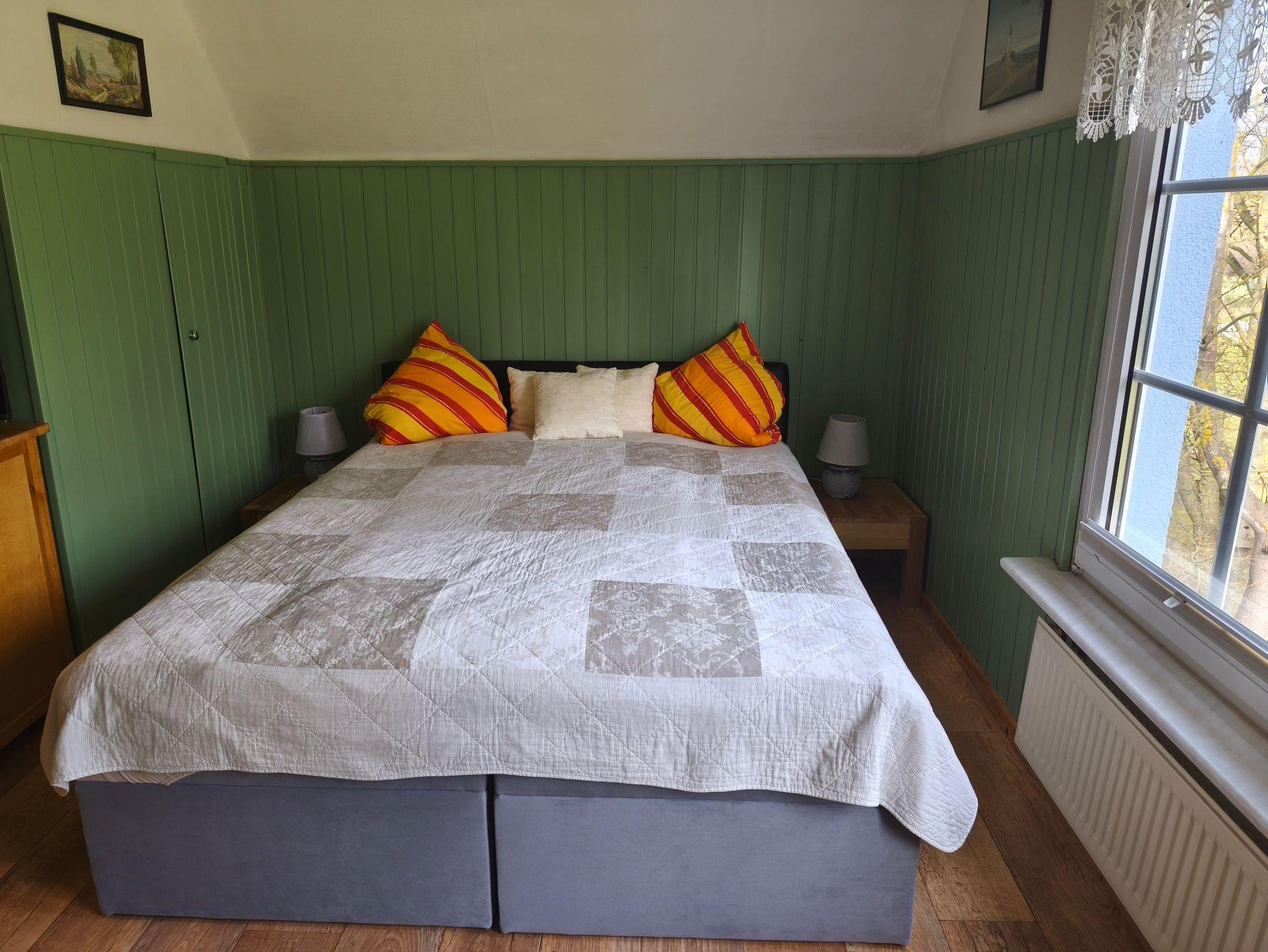 Die gemütliche Ferienwohnung ist ca. 35 qm groß. Der Schlafbereich ist ausgestattet mit einer Doppelliege und zwei Nachttischen inkl. Lampen.