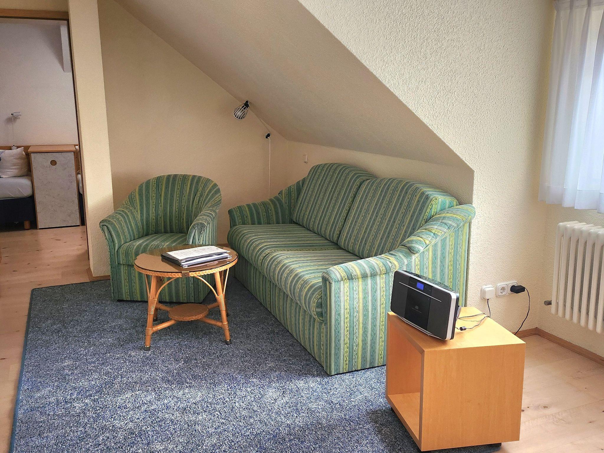 Dieses Dachgeschoss-Apartment steht für gemütlichen Rückzugsraum mit individuellem Charakter. Auf rund 30 m² bietet es einen separaten Schlafraum mit getrennt stehenden Betten, einen behaglichen Wohnbereich mit sichtbarem Dachbalken, eine eigene Küche sowie ein Bad mit Dusche und WC unter der Dachschräge.