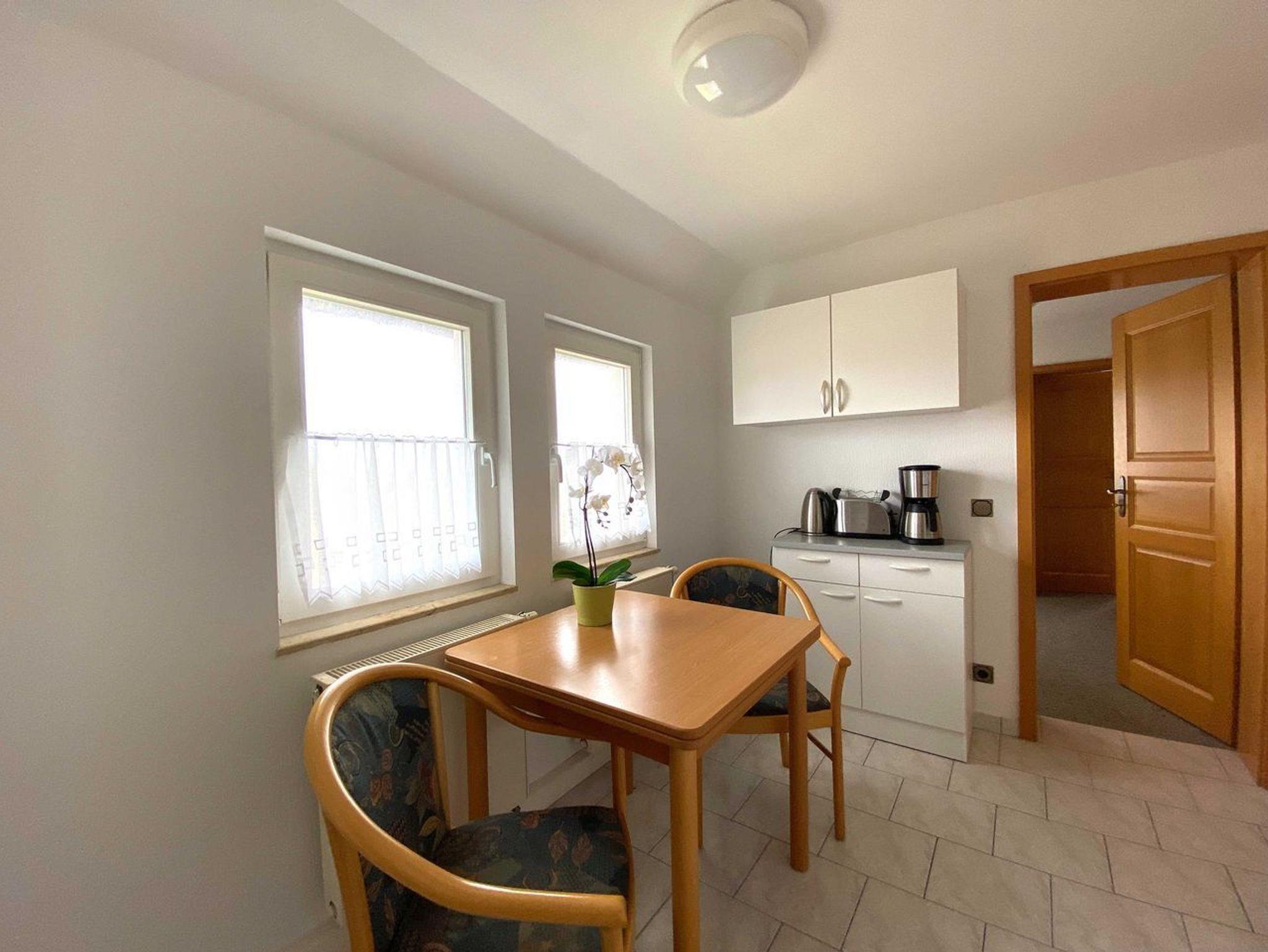 Das 2-Raum-Appartement im 1. Obergeschoss befindet sich im alten Bettenhaus. Die 36 Quadratmeter sind ideal für Paare oder kleine Familien.[nbsp] Das helle und freundliche Wohnzimmer mit dem Flat TV lädt zu gemütlichen und geselligen Fernseh- oder Spieleabenden ein. Das bequeme Sofa lässt sich im Nu zu einer bequemen Schlafstätte umwandeln, so dass das Appartement Platz für bis zu 3 Personen bietet. In der separaten Küche ist ein Esstisch, Kühlschrank mit 2 Platten, Wasserkocher, Toaster, Kaffeemaschine, Gläser, Besteck und Kochutensilien vorhanden.[nbsp] Das bequeme Doppelbett im Schlafzimmer verspricht einen erholsamen Schlaf. Das kleine, aber feine Badezimmer bietet Ihnen eine Dusche, ein WC und einen Haartrockner.