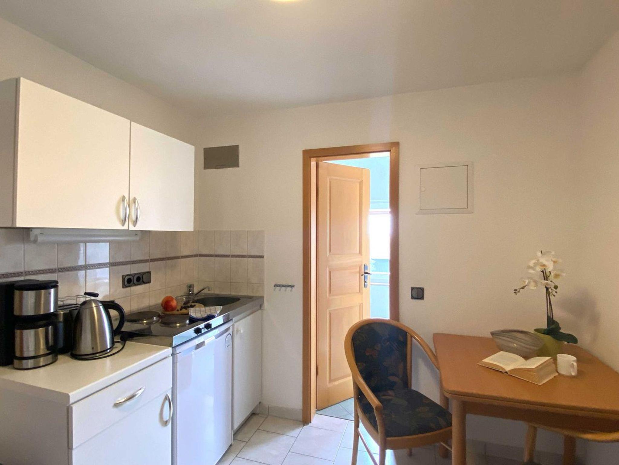 Das helle und freundliche 1-Raum-Appartement befindet sich im 1. Obergeschoss und hat eine Größe von 25 Quadratmetern, ideal für Singles oder verliebte Pärchen. Der kombinierte Wohn-, Koch und Essbereich verfügt über einen Esstisch und eine kleine Pantryküche (Kühlschrank, 2 Kochplatten, Wasserkocher, Toaster, Kaffeemaschine, Gläser, Besteck, Kochutensilien). Erholsamen Schlaf verspricht das bequeme Doppelbett im Schlafbereich oder genießen Sie dort einfachen einen entspannten Fernsehabend. Im Badezimmer sind Dusche, ein WC und ein Haartrockner vorhanden.