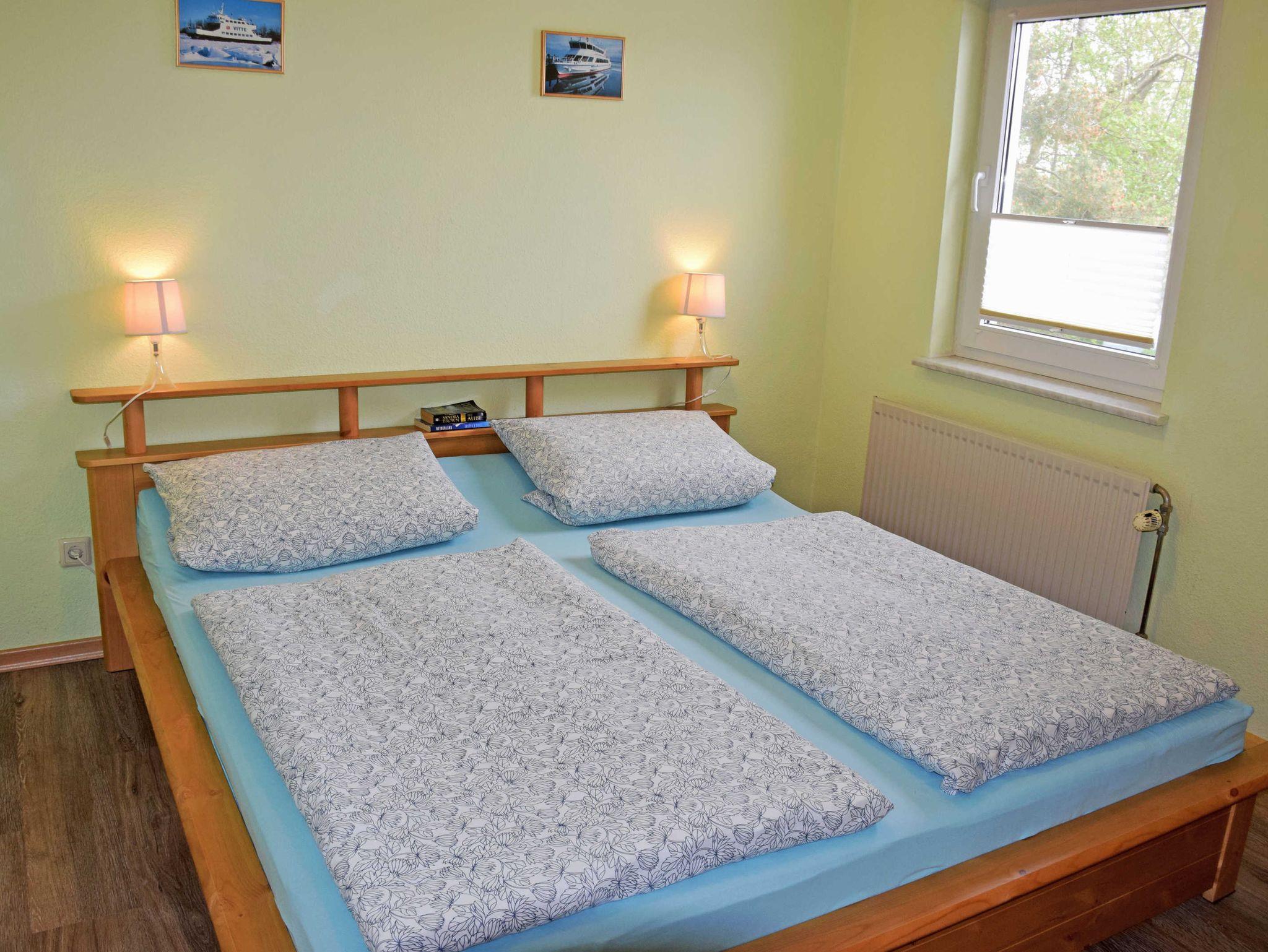 Vom Wohnzimmer aus gelangt man auf die Sonnenterrasse mit Gartenmöbeln, davor befindet sich eine Liegewiese zum Sonnen. Im ersten Schlafzimmer steht ein bequemes Doppelbett mit Nachttischen und Leselampen sowie ein Kleiderschrank. Das zweite Schlafzimmer verfügt über die gleiche Ausstattung.