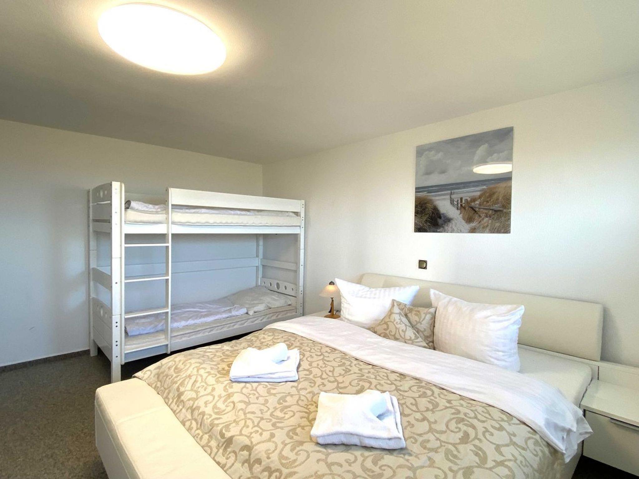 Das helle und freundliche 3-Raum Appartement befindet sich im Dachgeschoss des Süderhauses. Die Größe von 45 Quadratmetern eignet sich für einen Urlaub mit bis zu 5 Personen.[nbsp] In dem kombinierten Wohn-, Ess- und Kochbereich finden Sie ein gemütliches Sofa mit Ausziehfunktion, einen Esstisch und einen Flat TV. Bereiten Sie für Ihre Lieben in der intergrierten Pantryküche ein leckeres Mittag- oder Abendessen zu. Diese ist mit einem Kühlschrank, Gefrierfach, 2 Kochplatten, Wasserkocher, Toaster, Kaffeemaschine, Gläser, Besteck und Kochutensilien ausgestattet.[nbsp] Das erste Schlafzimmer bietet Platz für 4 Personen und ist ausgestattet mit einem Doppelbett, einem Etagenbett und einem Flat-TV. Das zweite Schlafzimmer bietet Platz für zwei weitere Gäste, auf dem gemütlichen Sofa mit Schlaffunktion und Flat TV.[nbsp] Das Badezimmer verspricht einen entspannten Relaxkomfort mit Eckbadewanne und Dusche. Ein WC und ein Haarföhn sind ebenfalls vorhanden.