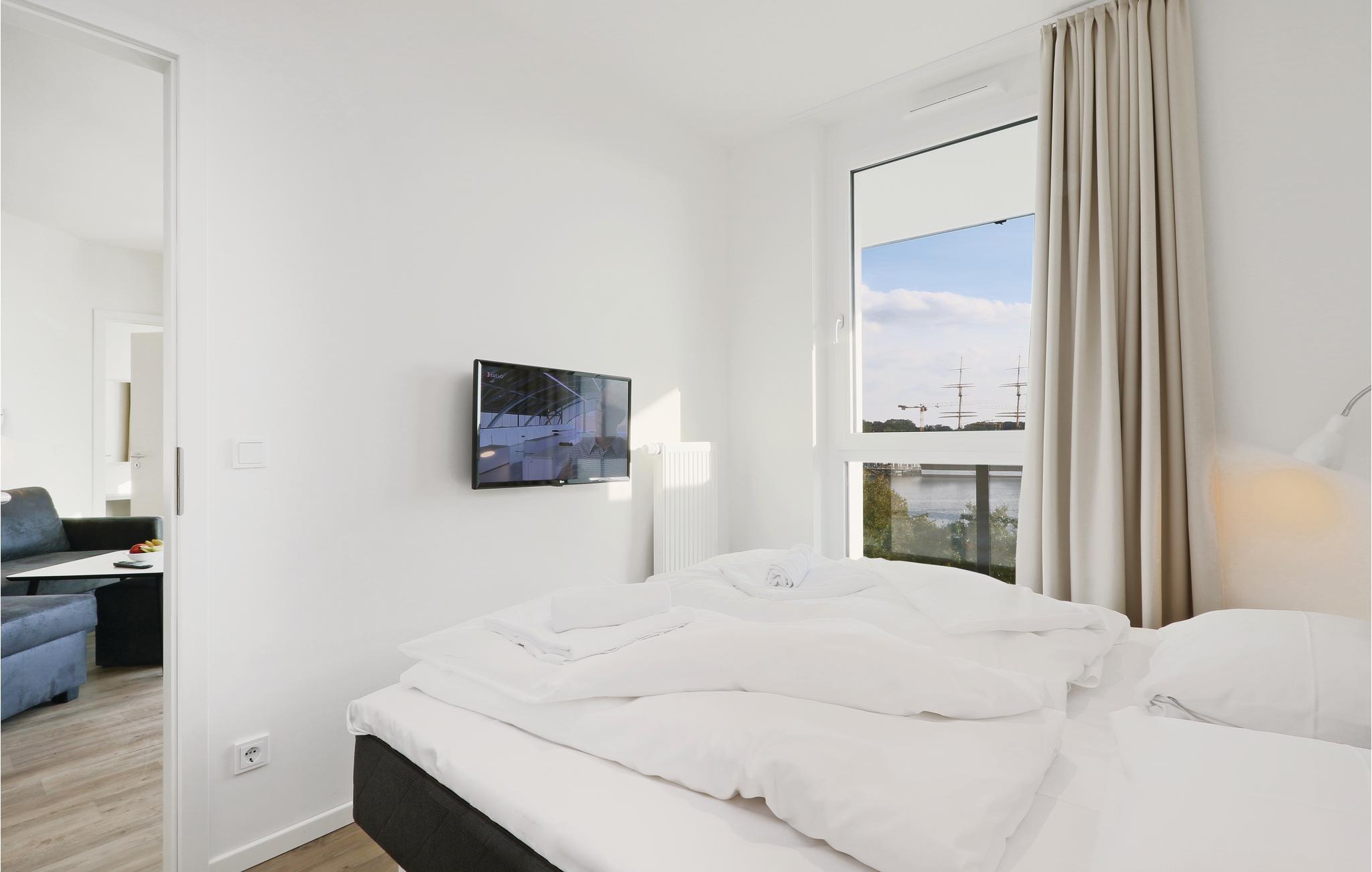Ferieleiligheten din ligger i 4. etasje i komplekset, og derfor har du en unik utsikt. Herfra kan du se ut over Priwall, sandstranden og havneutkjørselen med skipene som passerer. Den har to separate soverom, hvert med en koselig dobbeltseng. I stuen kan du gjøre deg komfortabel foran det koselige lyset fra bioetanolpeisen. I stuen finner du også sovesofaen, som tilbyr to ekstra soveplasser. En barneseng kan bare plasseres i stuen, da det ikke er nok plass på soverommet.