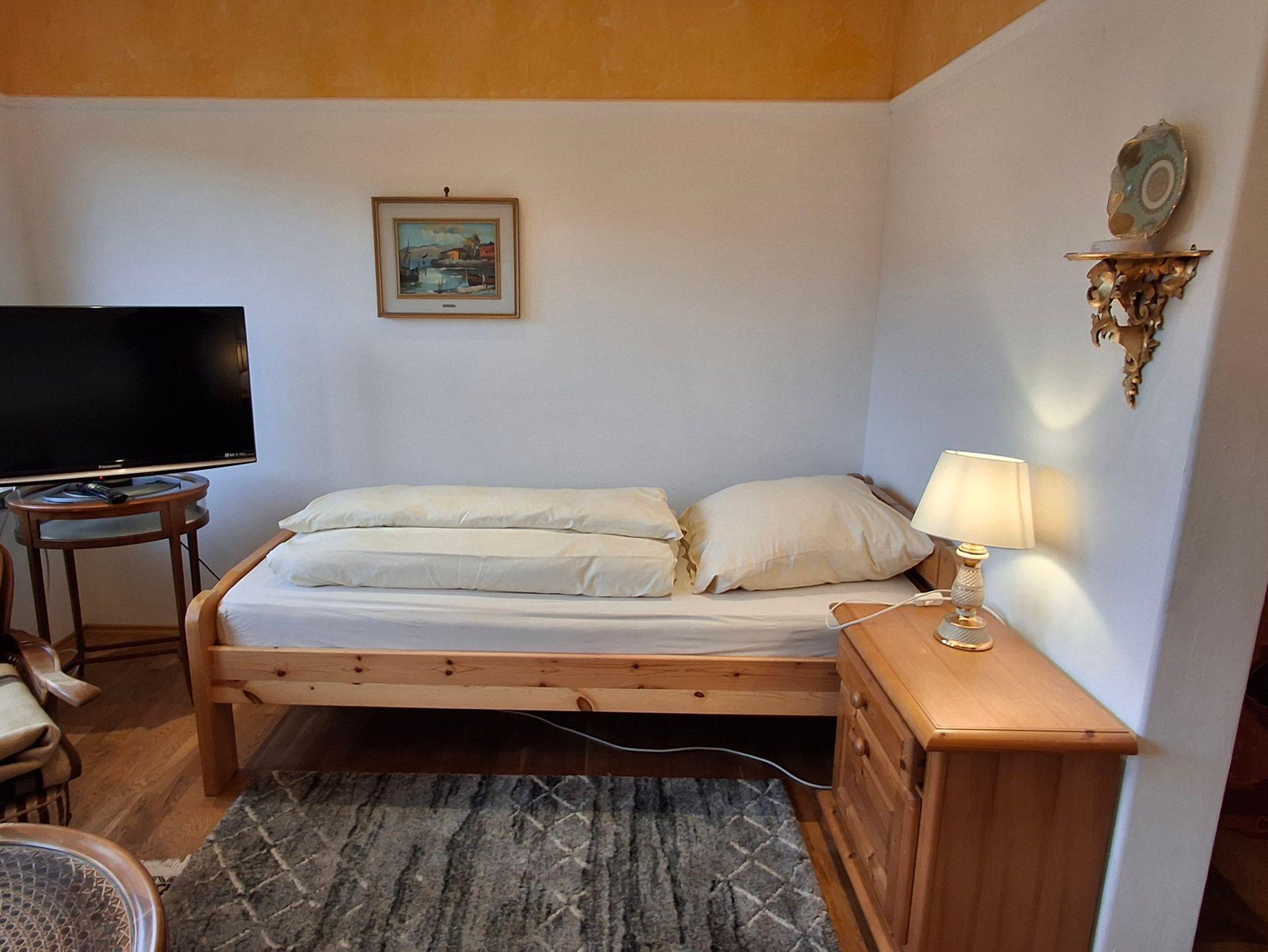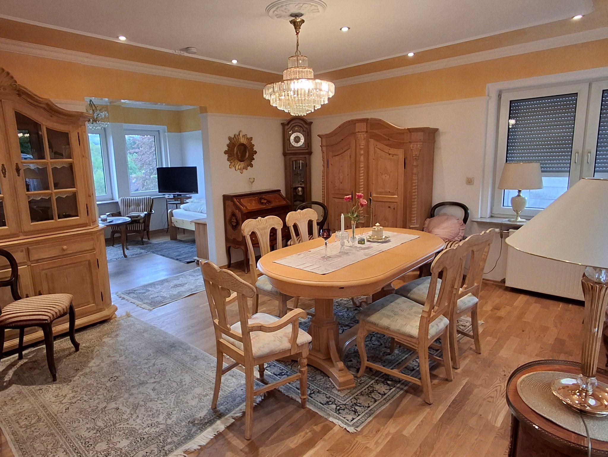 Im großen Zimmer, ca. 40 m², befinden sich ein Wohn-Essbereich sowie ein Schlafbereich mit 2 Einzelbetten und TV. Die Räume sind mit Stilmöbeln ausgestattet. Küche und Badezimmer sind gemeinschaftlich zu nutzen. Die Küche ist vollständig ausgestattet; Backofen, Kühl-Gefrierschrank, Wasserkocher und Toaster gehören ebenfalls dazu. Das Bad mit Dusche und WC ist zusätzlich mit einer Waschmaschine und einem Trockner ausgestattet. Wäscheständer und Waschmittel stehen ebenfalls zur Verfügung. Anmietung der gesamten Wohnung auf Anfrage!