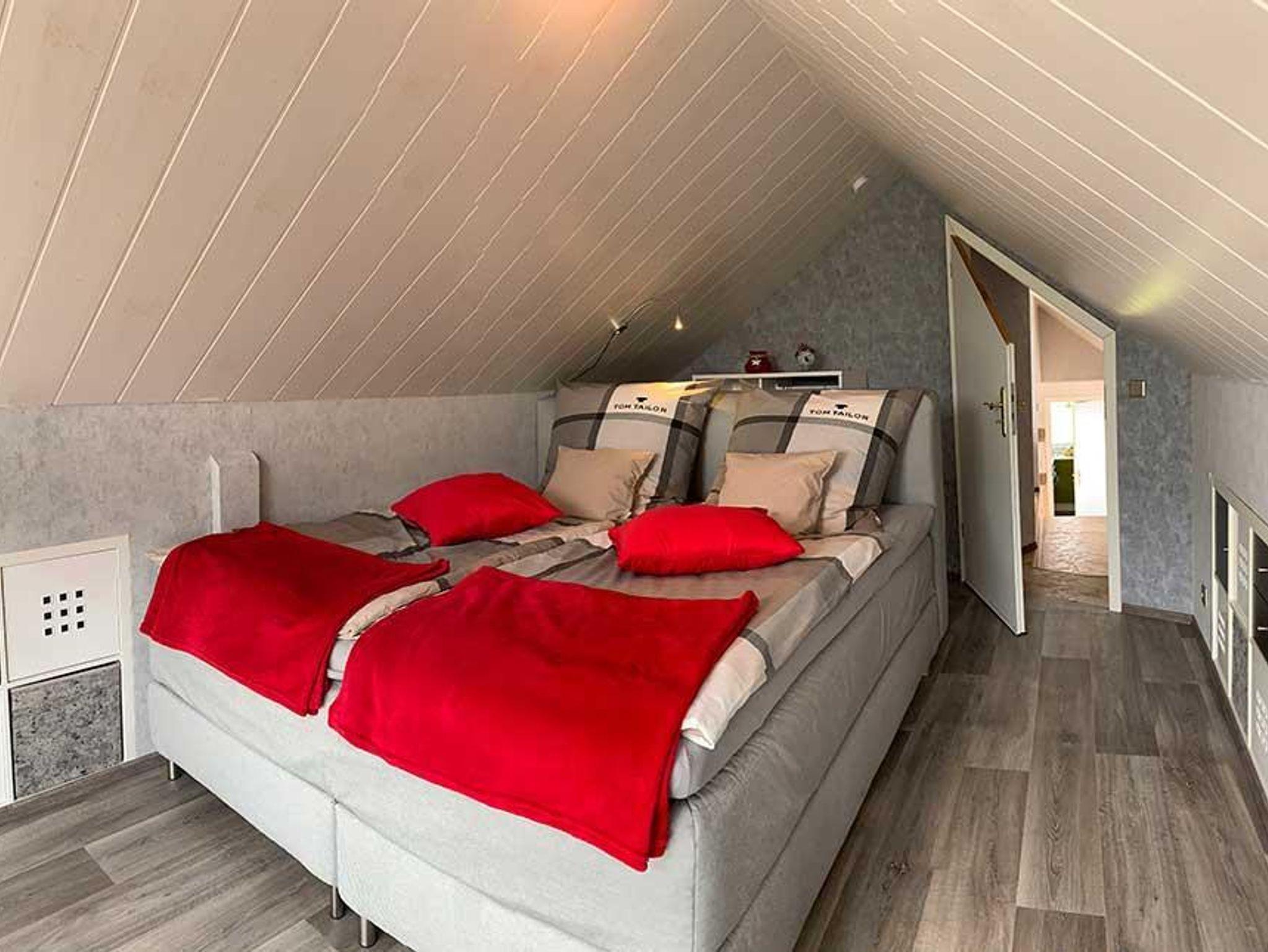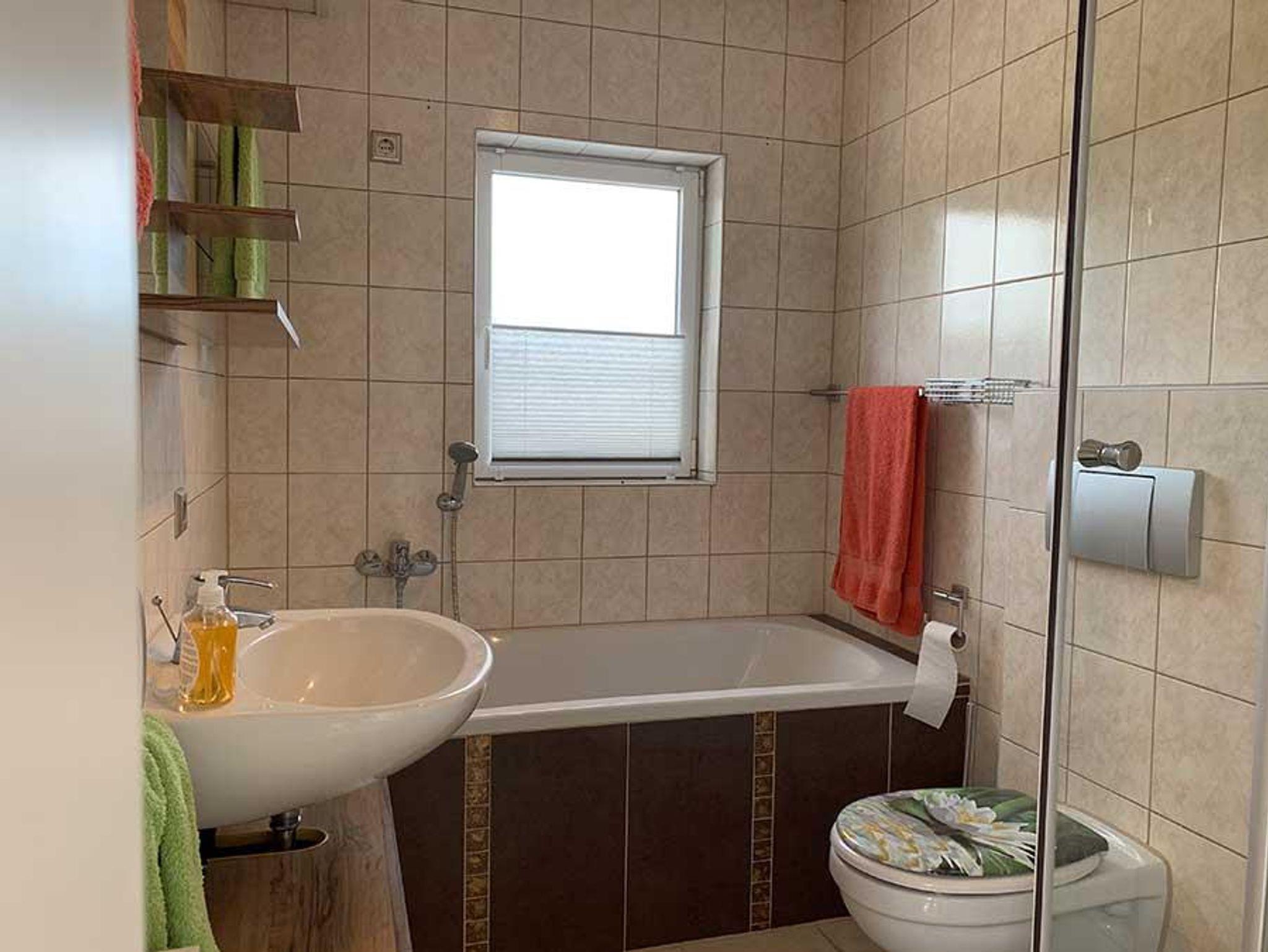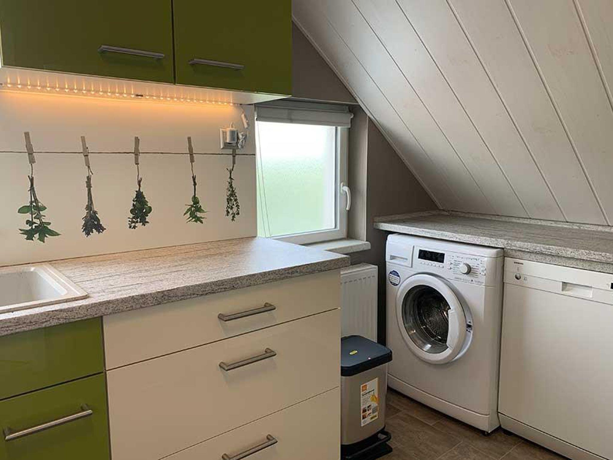 Das Wohnzimmer ist mit einer bequemen Ledereckcouch und einem Sat TV ausgestattet. In Esszimmer finden Sie eine Tischgruppe für 5 Erwachsene. Die Küche ist ausgestattet mit Ceranfeld und Backofen, großer Kühlschrank mit Gefrierfächer, Geschirrspülmaschine, Mikrowelle, Eierkocher, Toaster, Kaffeemaschine, Wasserkocher,Waffeleisen, Handmixer, Waschmaschine, alle nötigen Küchenutensilien und Geschirr. Im Schlafzimmer im Giebel befindet sich ein Boxspringbett 1,80 x 2.00m und im 2 Schlafzimmer ein Doppelbett 1,80 x2,00m. Das Bad ist ausgestattet mit Badewanne, Dusche und WC.