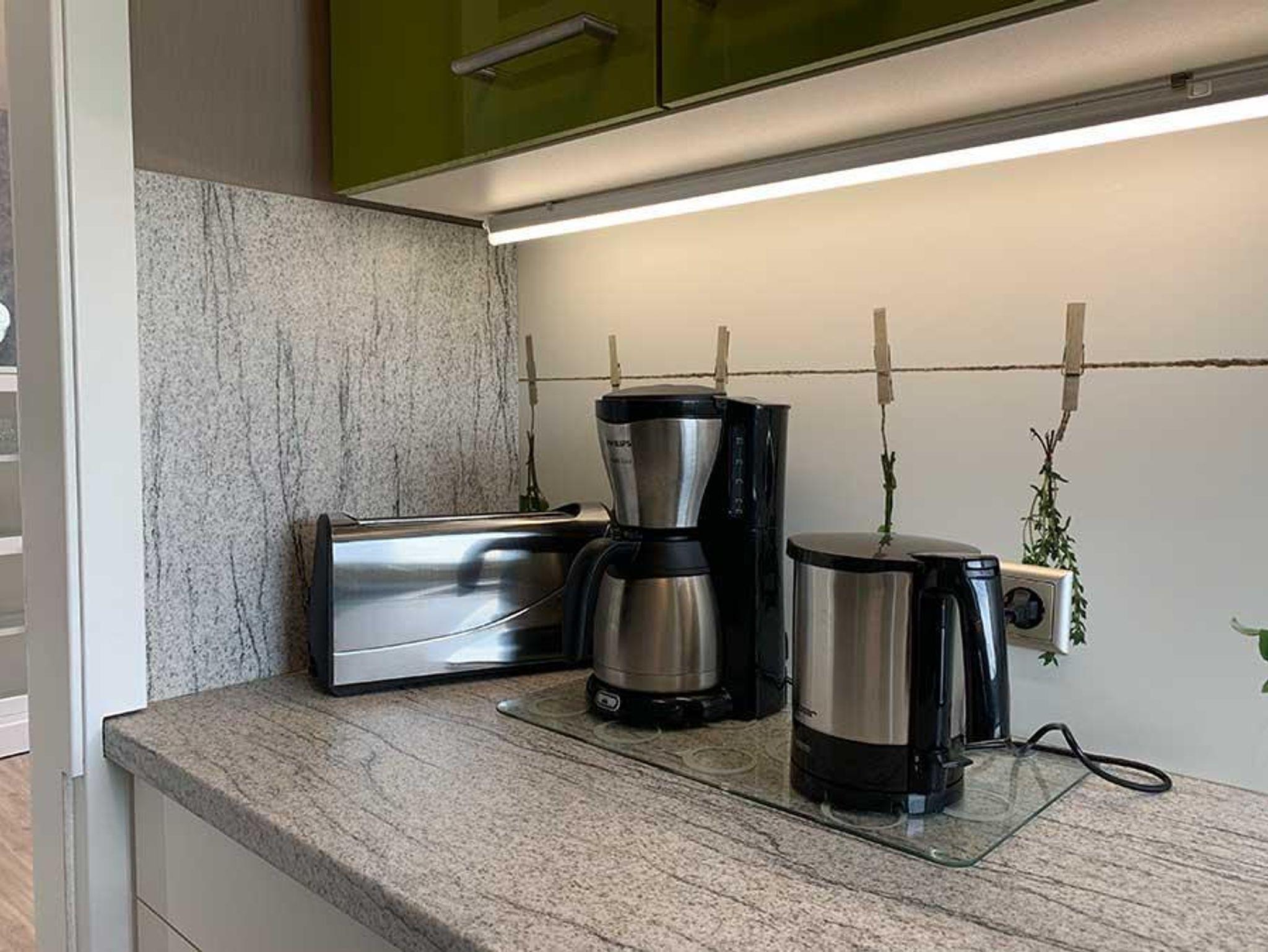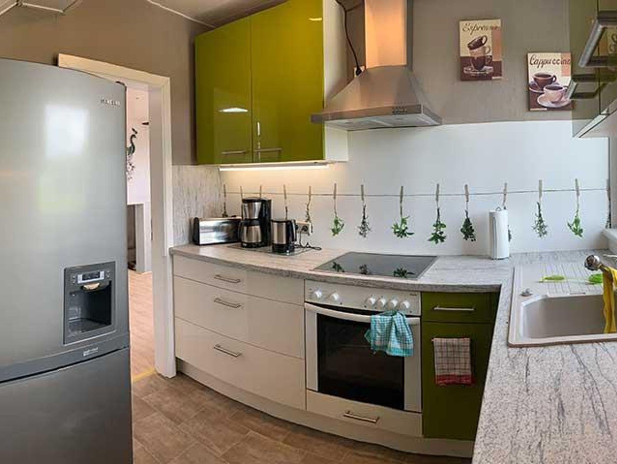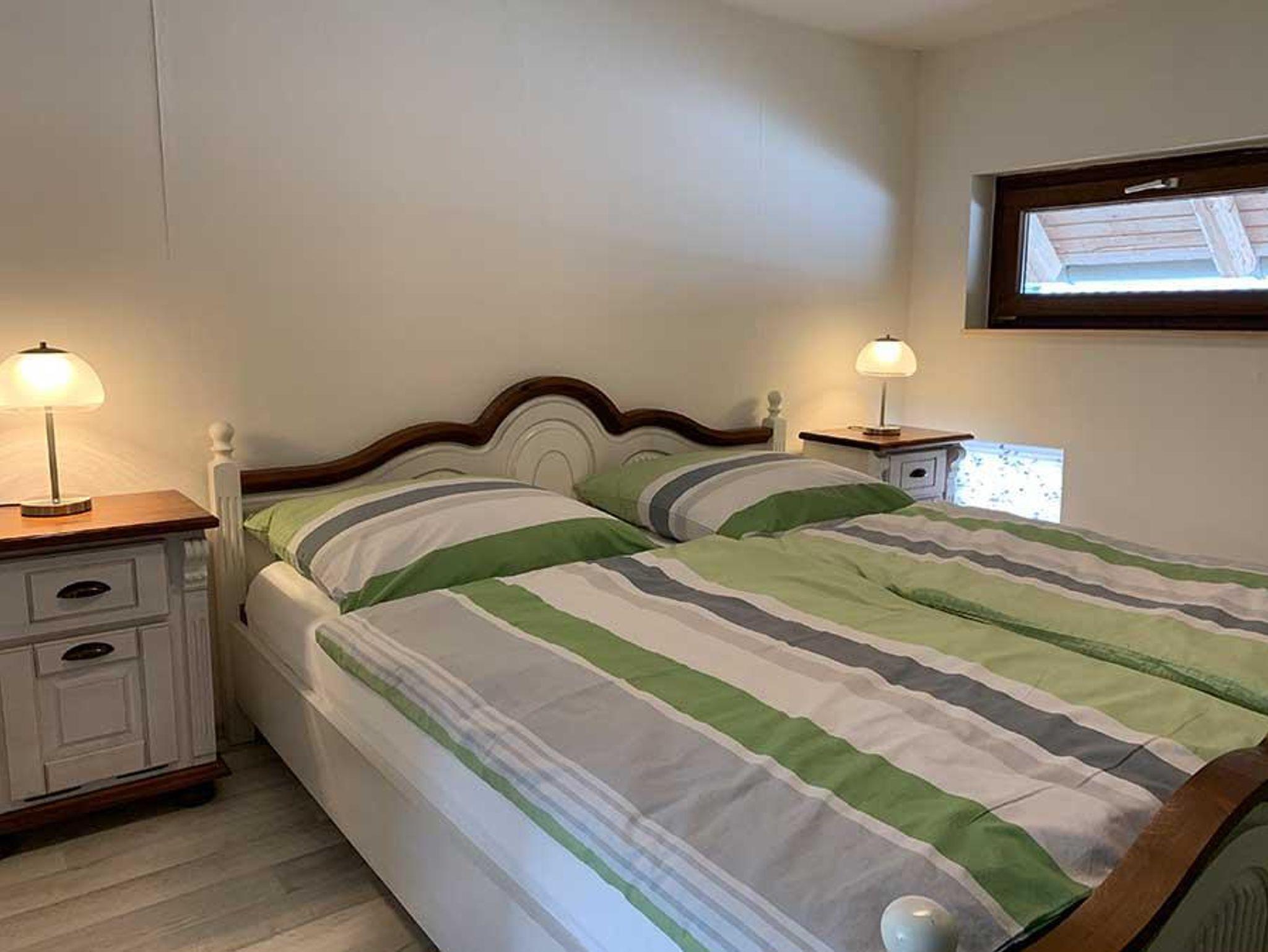 Das Wohnzimmer ist mit einer bequemen Ledereckcouch und einem Sat TV ausgestattet. In Esszimmer finden Sie eine Tischgruppe für 5 Erwachsene. Die Küche ist ausgestattet mit Ceranfeld und Backofen, großer Kühlschrank mit Gefrierfächer, Geschirrspülmaschine, Mikrowelle, Eierkocher, Toaster, Kaffeemaschine, Wasserkocher,Waffeleisen, Handmixer, Waschmaschine, alle nötigen Küchenutensilien und Geschirr. Im Schlafzimmer im Giebel befindet sich ein Boxspringbett 1,80 x 2.00m und im 2 Schlafzimmer ein Doppelbett 1,80 x2,00m. Das Bad ist ausgestattet mit Badewanne, Dusche und WC.