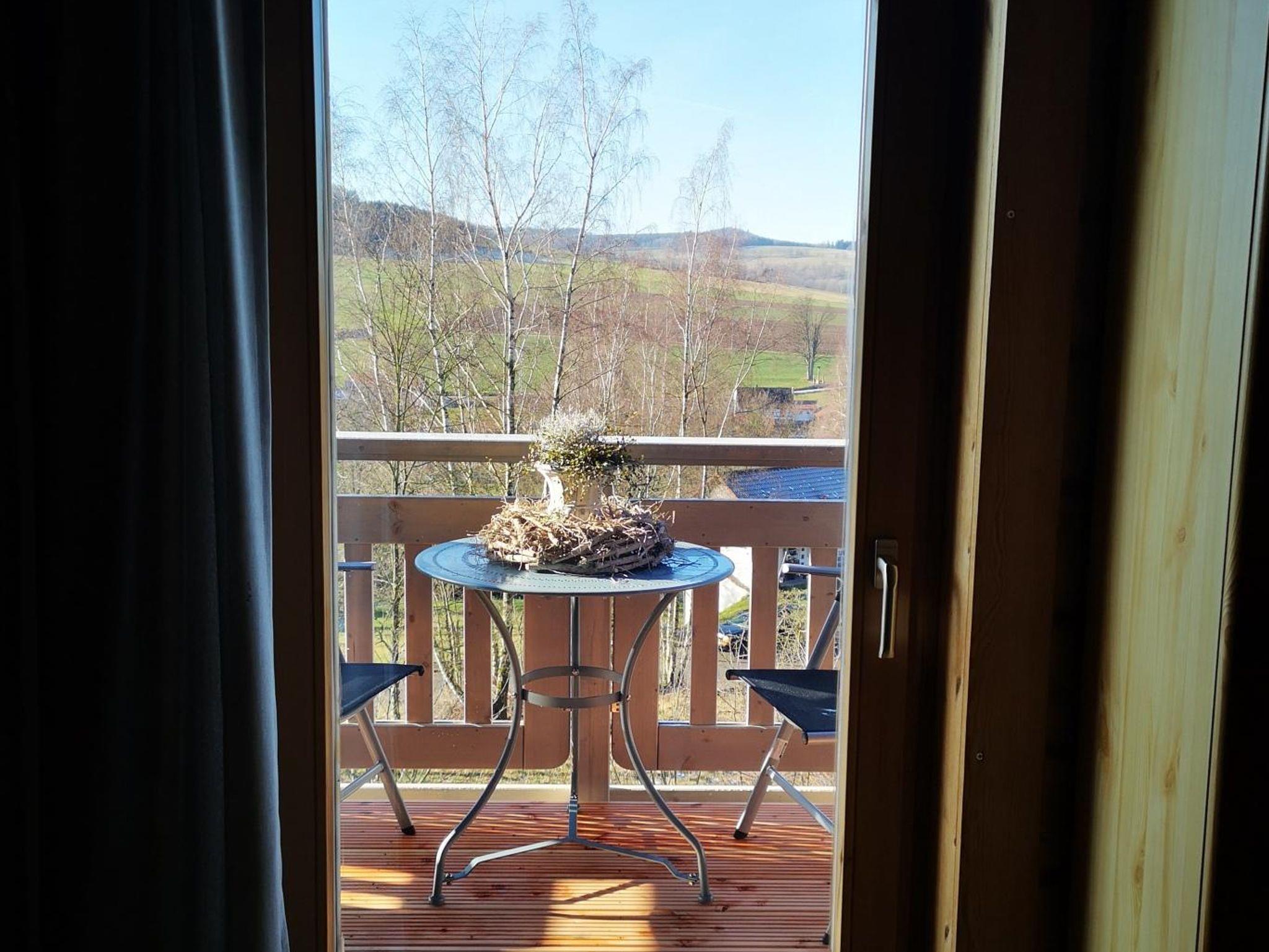 Genießen Sie die Aussicht auf Wiesen und Wald auf dem Balkon bzw. der Holzterrasse.