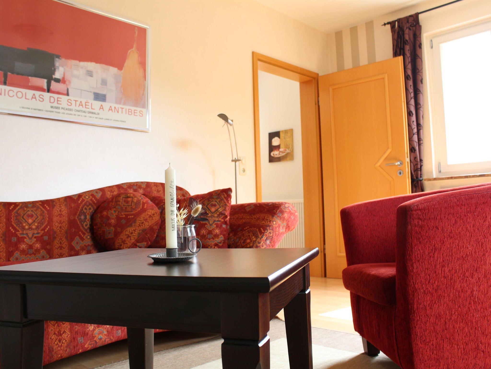 Die Ferienwohnung ist 55m² groß. Sie verfügt über ein Schlafzimmer mit Doppelbett (2x2m), ein Bad mit Dusche, ein Wohnzimmer mit Flachbildschirm und eine Küche mit Elektroherd und Backofen, einem Kühlschrank mit Gefrierteil. Kaffeemaschine, Toaster, Eierkocher und ein Wasserkocher sind vorhanden. In der Küche befindet sich ein ausziehbarer Tisch mit zwei Stühlen. Im Garten finden sie eine Sitzgelegenheit und zwei Relaxliegen. Der kostenfreie Parkplatz befindet sich vor dem Haus. Eine Unterstellmöglichkeit für Fahrräder, Skier und Schlitten ist vorhanden.