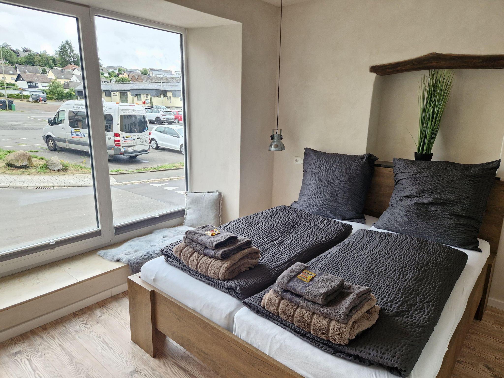 Sie ist 74 m² groß und verfügt über 2 Schlafzimmer, 1 Wohnzimmer, 1 Küche, 1 Bad. Das geräumigere Schlafzimmer verfügt über ein Doppelbett und einen 3.- türigen Kleiderschrank sowie einer Kofferablage. Hier, im Schlafzimmer, besteht auch die räumliche Möglichkeit, das Kinder- Reisebettchen aufzustellen. Das kleinere Schlafzimmer ist ausgestattet mit einem ausziehbaren Etagenbett für Erwachsene und einem Bürotisch+ Stuhl. Beide Zimmer sind vom Gästeflur begehbar. Das Wohnzimmer lädt Sie, mit seiner geräumigen, ausziehbaren Couch ein, einfach mal die Beine hochzulegen und den Abend bei guter Musik oder dem TV ausklingen zu lassen. Schauen Sie aus den Wohnzimmerfenstern, bietet sich Ihnen ein hervorragender Blick auf den direkt angrenzenden Viehmarkt, an dem jeden Donnerstag ein reges Treiben (Markttag) herrscht. Außerdem befindet sich auf der gegenüberliegenden Straßenseite die Eifel- Alm, eine Erlebnisgastronomie. Alle drei Zimmer sind zusätzlich mit Außenrollläden ausgestattet, die eine hervorragende Abdunkelung der Zimmer gewährleisten. Die geräumige Küche bietet einen fantastischen Ausblick auf die ehemalige Stadtmauer aus dem 13. Jhd. sowie einen Ausblick in das Bolsdorfer Tälchen, mit seinem 1,5 km langen Barfußweg und seinen 22 Stationen sowie zahlreichen Wanderwege. Außerdem, aus dem Küchenfester geschaut, lassen sich traumhafte Sonnenuntergänge genießen. Der geräumige Küchentisch biete Platz für 6 Personen + einem Kinderstuhl, so dass hier bequem die gesamte Familie Platz hat um nach dem Abendessen Brettspiele zu spielen. Das Badezimmer ist ausgestattet mit einer Badewanne, WC, WB, Fön sowie einem Kindertöpfchen. Eine Wickelunterlage ist ebenso vorhanden, wie eine Babywanne und Kindergeschirr in doppelter Anzahl. Eine Waschmaschine und ein Trockner befinden sich im kleinen Hauswirtschaftsraum der Gästewohnung und sind unentgeltlich nutzbar. Die Touristenabgabe von 1,50€ pro Person ist ebenso enthalten wie 1 Flasche naturell pro Person und einer Flasche Wein bei Ankunft sowie die Energiekosten. Bettwäsche und ein großes + ein kleines Handtuch pro Person (zur Nutzung während des Aufenthaltes) werden mit € 15,- pro Person berechnet.