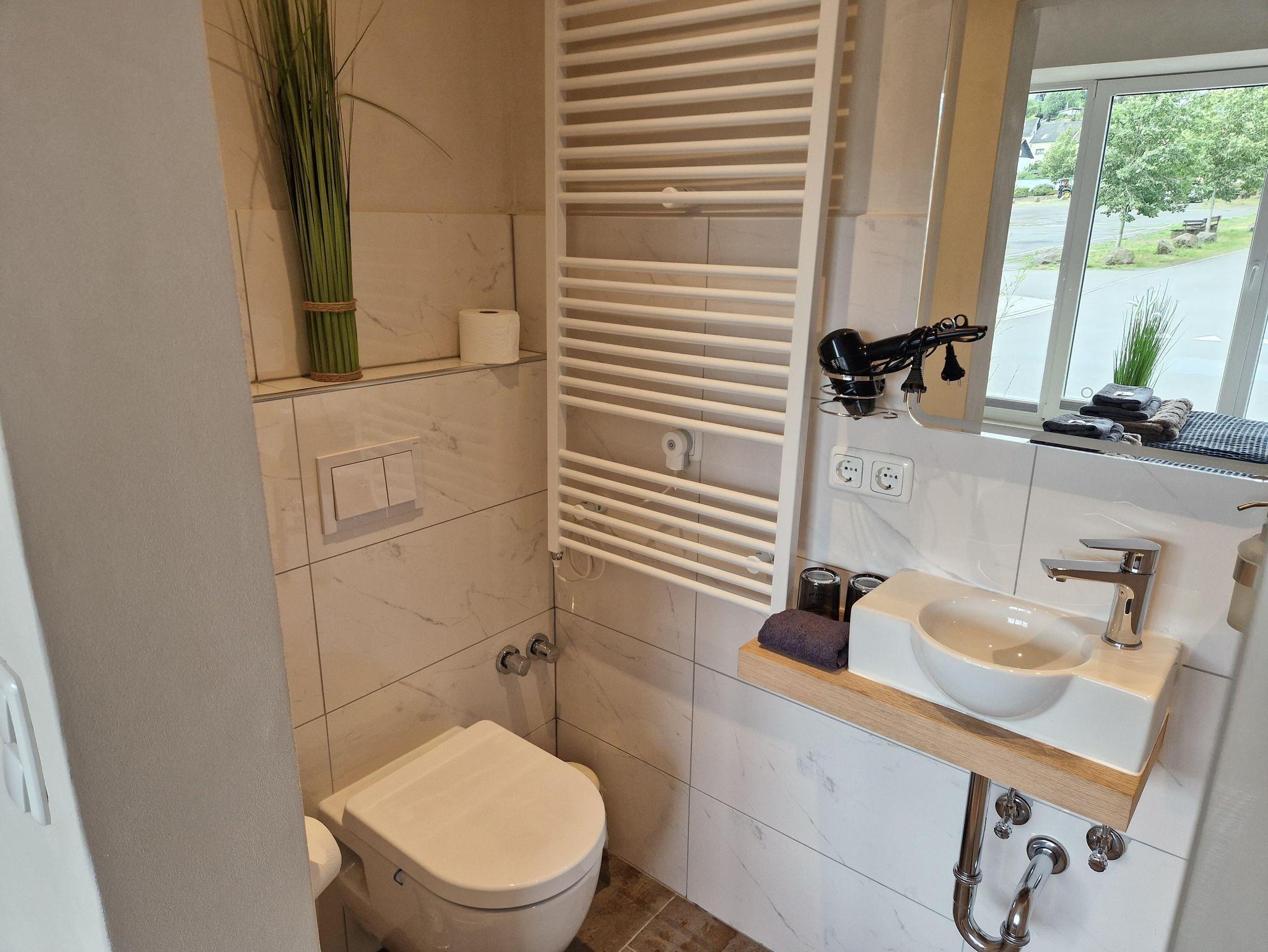 Sie ist 74 m² groß und verfügt über 2 Schlafzimmer, 1 Wohnzimmer, 1 Küche, 1 Bad. Das geräumigere Schlafzimmer verfügt über ein Doppelbett und einen 3.- türigen Kleiderschrank sowie einer Kofferablage. Hier, im Schlafzimmer, besteht auch die räumliche Möglichkeit, das Kinder- Reisebettchen aufzustellen. Das kleinere Schlafzimmer ist ausgestattet mit einem ausziehbaren Etagenbett für Erwachsene und einem Bürotisch+ Stuhl. Beide Zimmer sind vom Gästeflur begehbar. Das Wohnzimmer lädt Sie, mit seiner geräumigen, ausziehbaren Couch ein, einfach mal die Beine hochzulegen und den Abend bei guter Musik oder dem TV ausklingen zu lassen. Schauen Sie aus den Wohnzimmerfenstern, bietet sich Ihnen ein hervorragender Blick auf den direkt angrenzenden Viehmarkt, an dem jeden Donnerstag ein reges Treiben (Markttag) herrscht. Außerdem befindet sich auf der gegenüberliegenden Straßenseite die Eifel- Alm, eine Erlebnisgastronomie. Alle drei Zimmer sind zusätzlich mit Außenrollläden ausgestattet, die eine hervorragende Abdunkelung der Zimmer gewährleisten. Die geräumige Küche bietet einen fantastischen Ausblick auf die ehemalige Stadtmauer aus dem 13. Jhd. sowie einen Ausblick in das Bolsdorfer Tälchen, mit seinem 1,5 km langen Barfußweg und seinen 22 Stationen sowie zahlreichen Wanderwege. Außerdem, aus dem Küchenfester geschaut, lassen sich traumhafte Sonnenuntergänge genießen. Der geräumige Küchentisch biete Platz für 6 Personen + einem Kinderstuhl, so dass hier bequem die gesamte Familie Platz hat um nach dem Abendessen Brettspiele zu spielen. Das Badezimmer ist ausgestattet mit einer Badewanne, WC, WB, Fön sowie einem Kindertöpfchen. Eine Wickelunterlage ist ebenso vorhanden, wie eine Babywanne und Kindergeschirr in doppelter Anzahl. Eine Waschmaschine und ein Trockner befinden sich im kleinen Hauswirtschaftsraum der Gästewohnung und sind unentgeltlich nutzbar. Die Touristenabgabe von 1,50€ pro Person ist ebenso enthalten wie 1 Flasche naturell pro Person und einer Flasche Wein bei Ankunft sowie die Energiekosten. Bettwäsche und ein großes + ein kleines Handtuch pro Person (zur Nutzung während des Aufenthaltes) werden mit € 15,- pro Person berechnet.