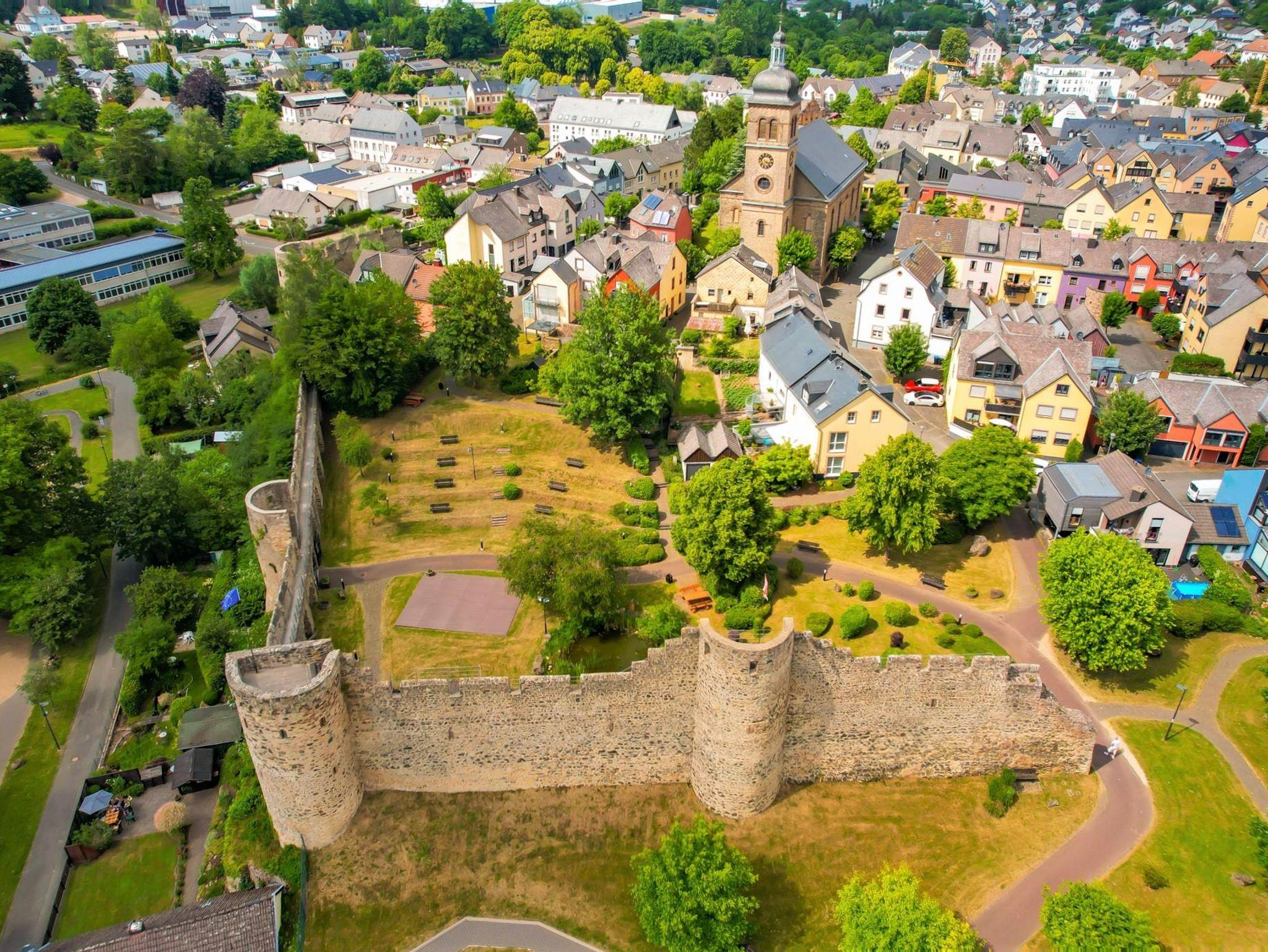 Die Zufahrt zur Gästewohnung befindet sich über die Hofseite (Feuerwehrzufahrt). Hier steht Ihnen ein Garagenplatz zur Verfügung. Ebenso ist eine kleine Sitzgelegenheit im Hof vorhanden. Gehen Sie die angrenzenden Treppenstufen hinunter, gelangen Sie sofort zur links gelegenen Grundschule. In der Grundschule befindet sich ein kleines Hallenbad, welches in den Nachmittagsstunden öffentlich zugänglich ist. Also: Packen Sie die „Badehosen“ ein. Die genauen Öffnungszeiten können Sie unter: Tel. 06591 4538 erfragen. Weiter Hallenbäder sind in Gerolstein (ca. 9 km) und Jünkerath (ca. 13 km) entfernt.