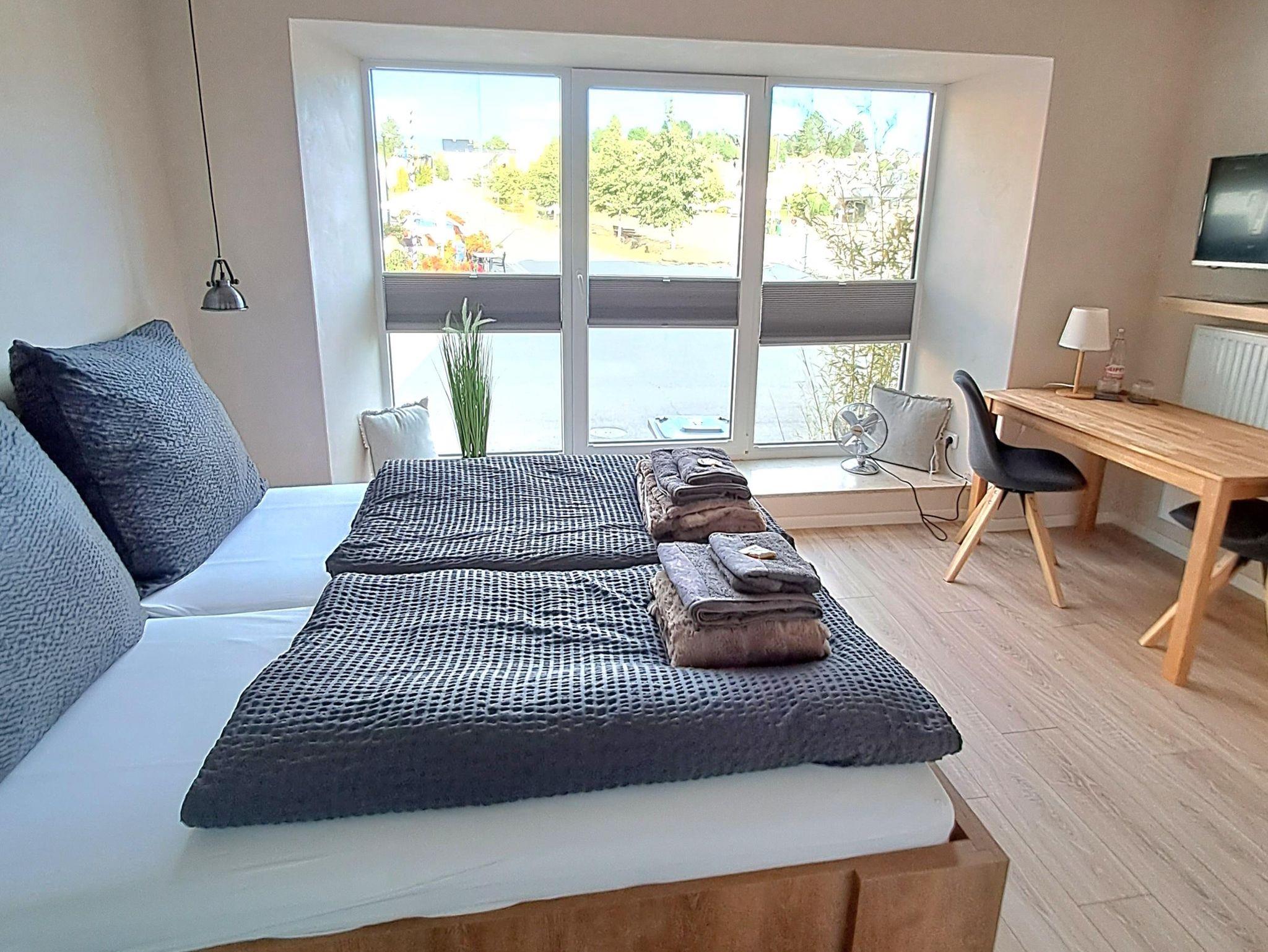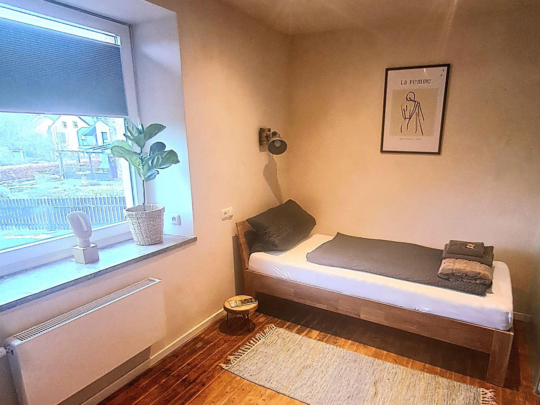Sie ist 74 m² groß und verfügt über 2 Schlafzimmer, 1 Wohnzimmer, 1 Küche, 1 Bad. Das geräumigere Schlafzimmer verfügt über ein Doppelbett und einen 3.- türigen Kleiderschrank sowie einer Kofferablage. Hier, im Schlafzimmer, besteht auch die räumliche Möglichkeit, das Kinder- Reisebettchen aufzustellen. Das kleinere Schlafzimmer ist ausgestattet mit einem ausziehbaren Etagenbett für Erwachsene und einem Bürotisch+ Stuhl. Beide Zimmer sind vom Gästeflur begehbar. Das Wohnzimmer lädt Sie, mit seiner geräumigen, ausziehbaren Couch ein, einfach mal die Beine hochzulegen und den Abend bei guter Musik oder dem TV ausklingen zu lassen. Schauen Sie aus den Wohnzimmerfenstern, bietet sich Ihnen ein hervorragender Blick auf den direkt angrenzenden Viehmarkt, an dem jeden Donnerstag ein reges Treiben (Markttag) herrscht. Außerdem befindet sich auf der gegenüberliegenden Straßenseite die Eifel- Alm, eine Erlebnisgastronomie. Alle drei Zimmer sind zusätzlich mit Außenrollläden ausgestattet, die eine hervorragende Abdunkelung der Zimmer gewährleisten. Die geräumige Küche bietet einen fantastischen Ausblick auf die ehemalige Stadtmauer aus dem 13. Jhd. sowie einen Ausblick in das Bolsdorfer Tälchen, mit seinem 1,5 km langen Barfußweg und seinen 22 Stationen sowie zahlreichen Wanderwege. Außerdem, aus dem Küchenfester geschaut, lassen sich traumhafte Sonnenuntergänge genießen. Der geräumige Küchentisch biete Platz für 6 Personen + einem Kinderstuhl, so dass hier bequem die gesamte Familie Platz hat um nach dem Abendessen Brettspiele zu spielen. Das Badezimmer ist ausgestattet mit einer Badewanne, WC, WB, Fön sowie einem Kindertöpfchen. Eine Wickelunterlage ist ebenso vorhanden, wie eine Babywanne und Kindergeschirr in doppelter Anzahl. Eine Waschmaschine und ein Trockner befinden sich im kleinen Hauswirtschaftsraum der Gästewohnung und sind unentgeltlich nutzbar. Die Touristenabgabe von 1,50€ pro Person ist ebenso enthalten wie 1 Flasche naturell pro Person und einer Flasche Wein bei Ankunft sowie die Energiekosten. Bettwäsche und ein großes + ein kleines Handtuch pro Person (zur Nutzung während des Aufenthaltes) werden mit € 15,- pro Person berechnet.