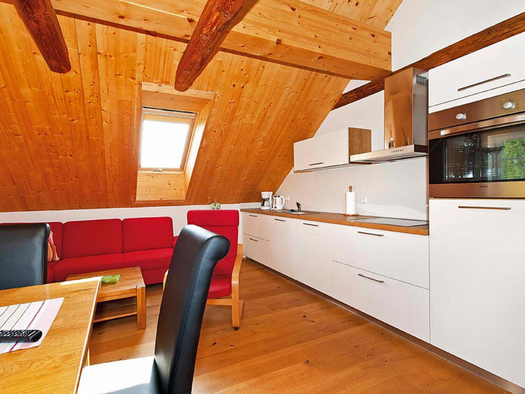 Der Wohnbereich verfügt über eine voll ausgestattete Küche mit Geschirrspüler, großem Esstisch, komfortable Sitzecke mit Schlafcouch und Flat-TV. Das Tageslicht-Badezimmer verfügt über Dusche und WC. Der Ost-Balkon ist über den Wohnbereich erreichbar. Kostenfreies WLAN steht zur Verfügung.