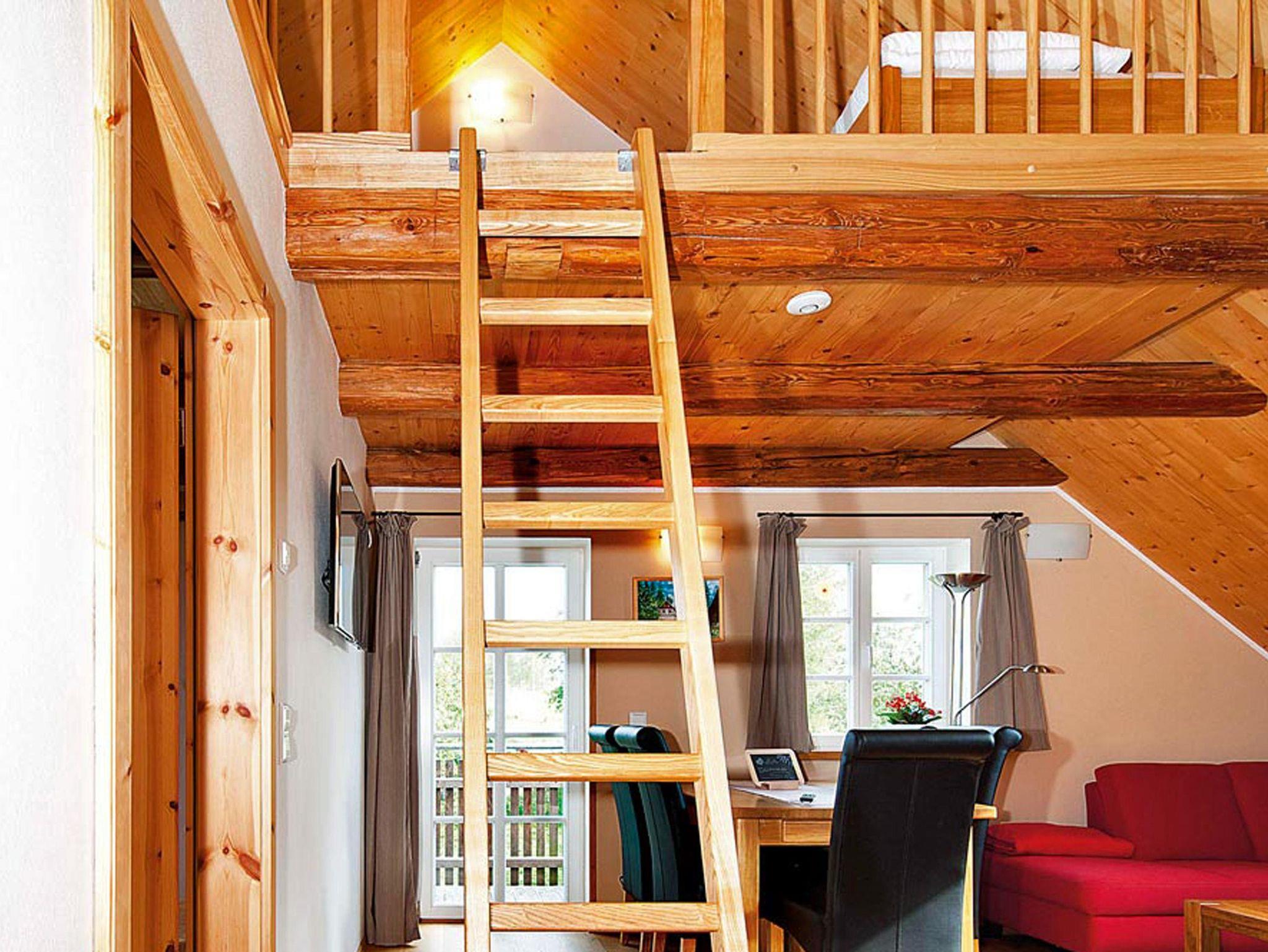Sie ist ausgestattet mit einem Schlafraum mit Doppelbett (180 cm x 200 cm) und zwei Einzelbetten. Oberhalb des Wohnbereiches auf der Galerie besteht die Möglichkeit von zwei weiteren Schlafmöglichkeiten (2 Betten).