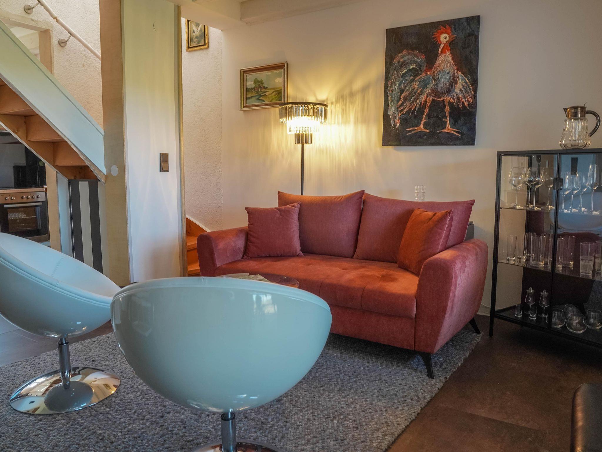 Auf rund 80 qm finden bei mir bis zu vier Personen Platz. Im Obergeschoss gibt es zwei Schlafzimmer: eines mit gemütlichem Boxspringbett (1,60 m) und Balkon, das andere mit zwei Einzelbetten (1 x 2 m) – beide mit eigenem Fernseher. Das Tageslichtbad befindet sich ebenfalls im Obergeschoss.