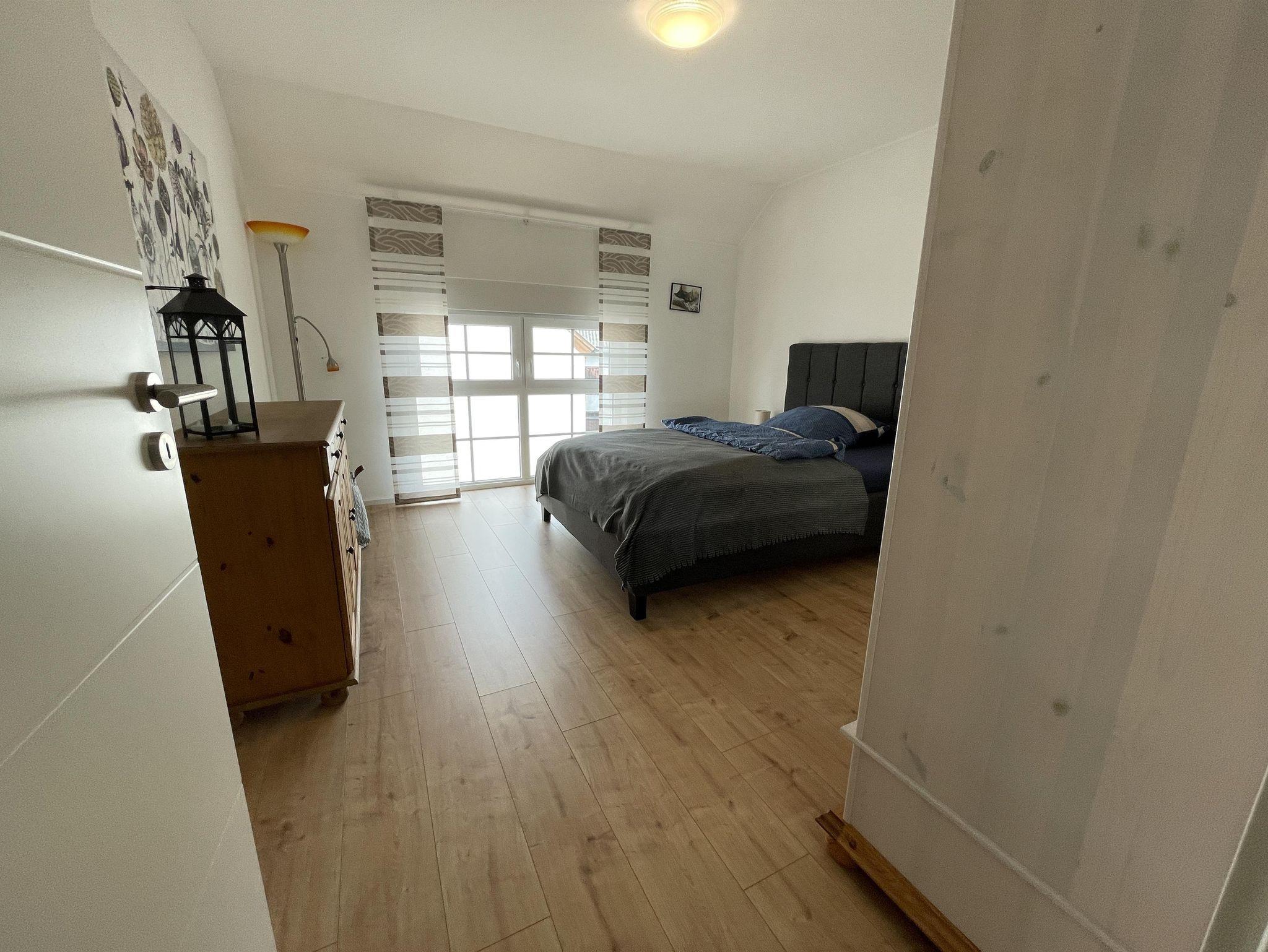 Im angrenzenden Schlafzimmer befindet sich ein Doppelbett mit offenem Fußende, sowie ein Kleiderschrank und eine Kommode.