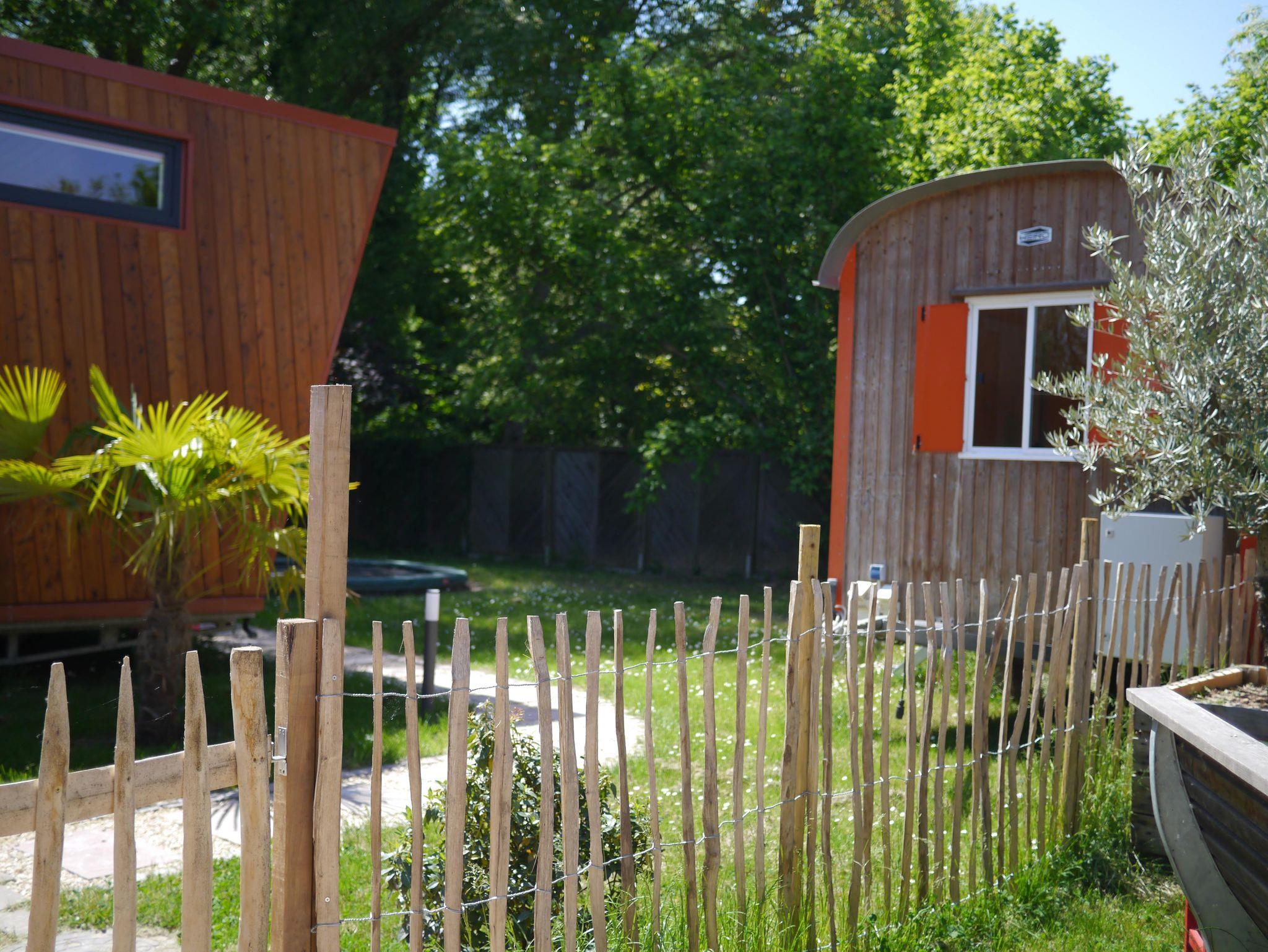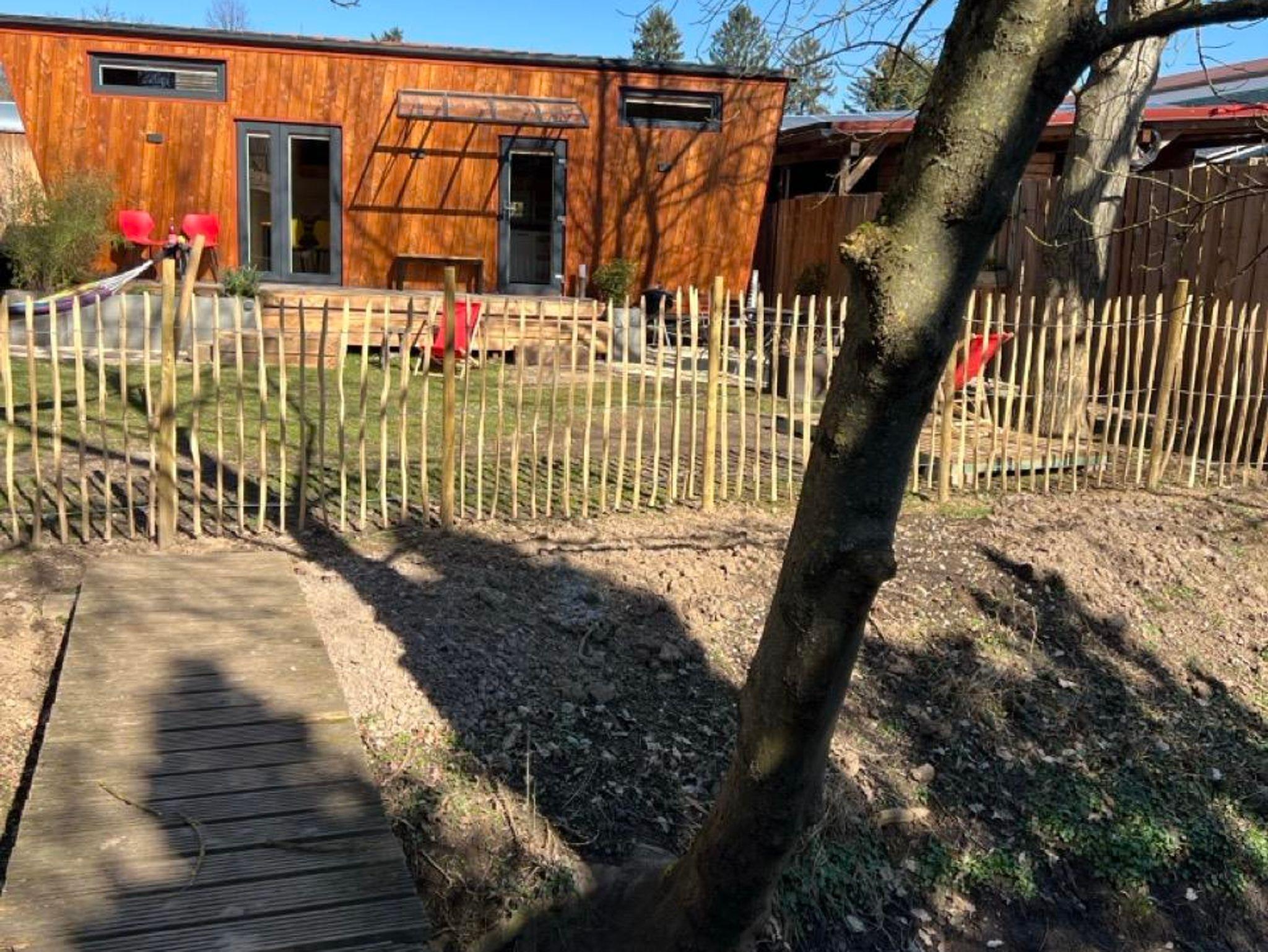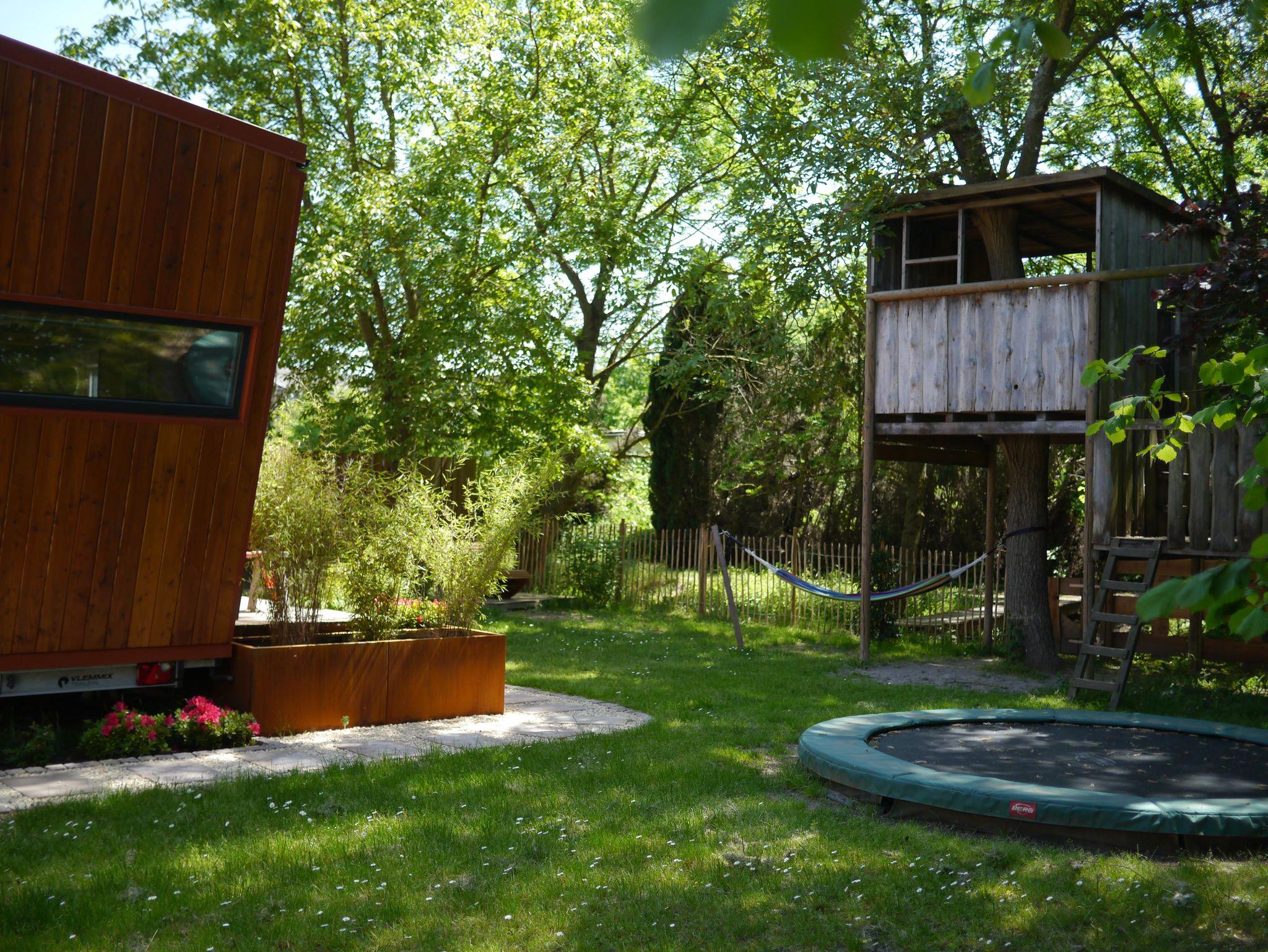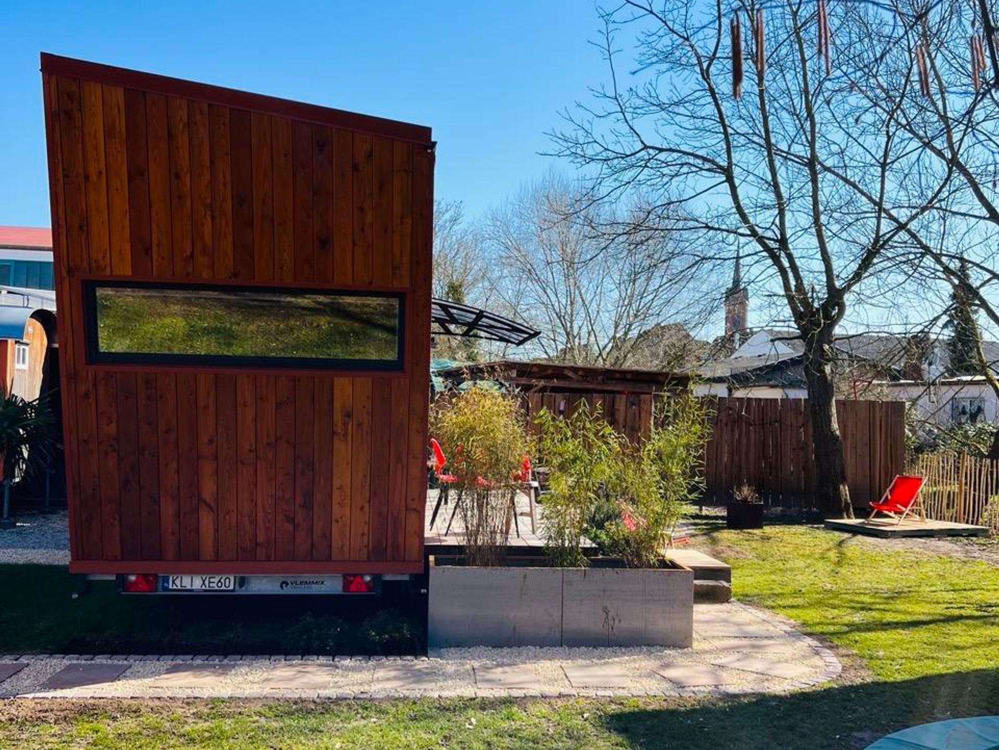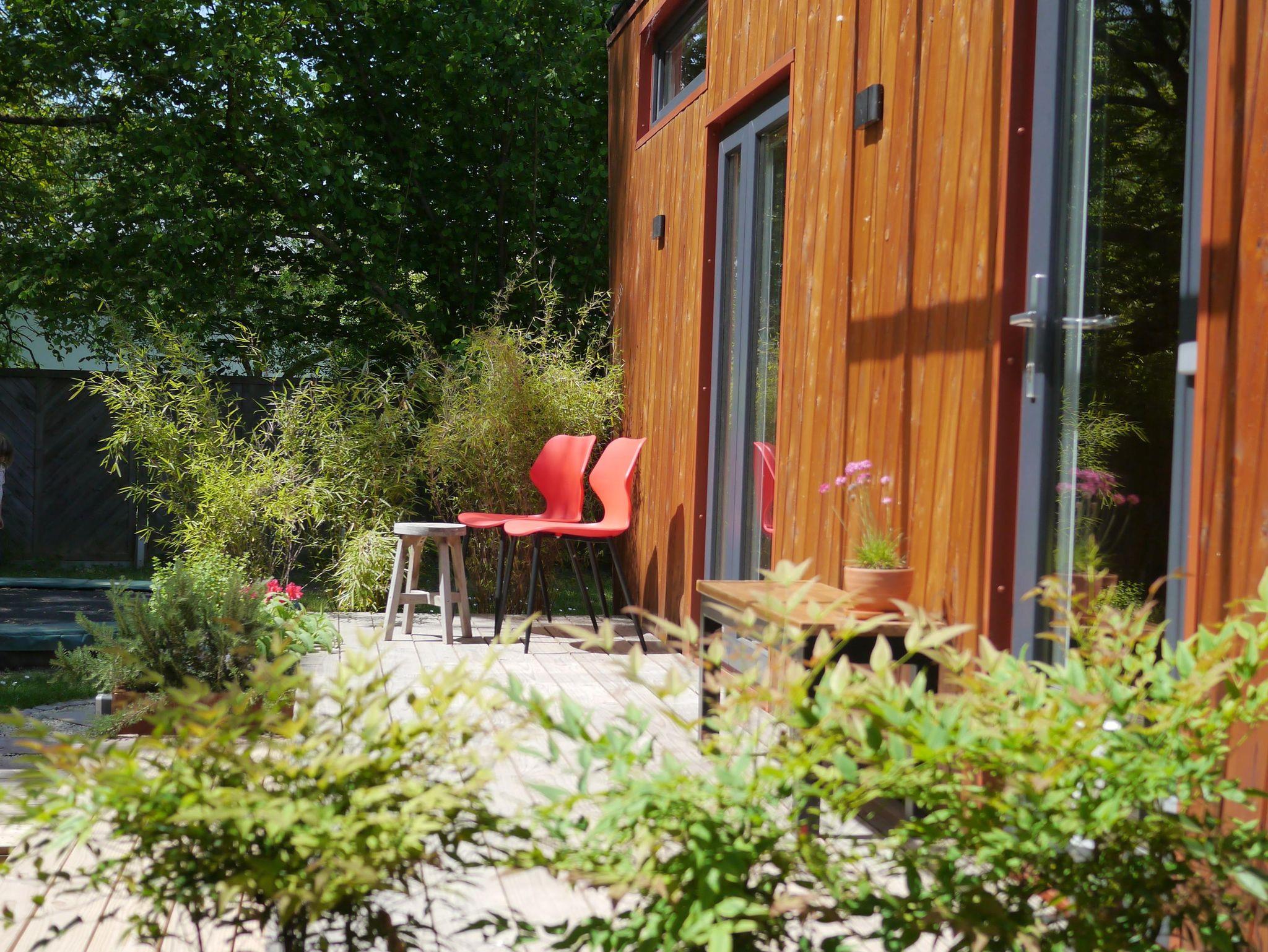 Das Tiny House fügt sich harmonisch in den schönen hinteren Teil unseres Gartens ein, wo sie sich ungestört zurückziehen können.