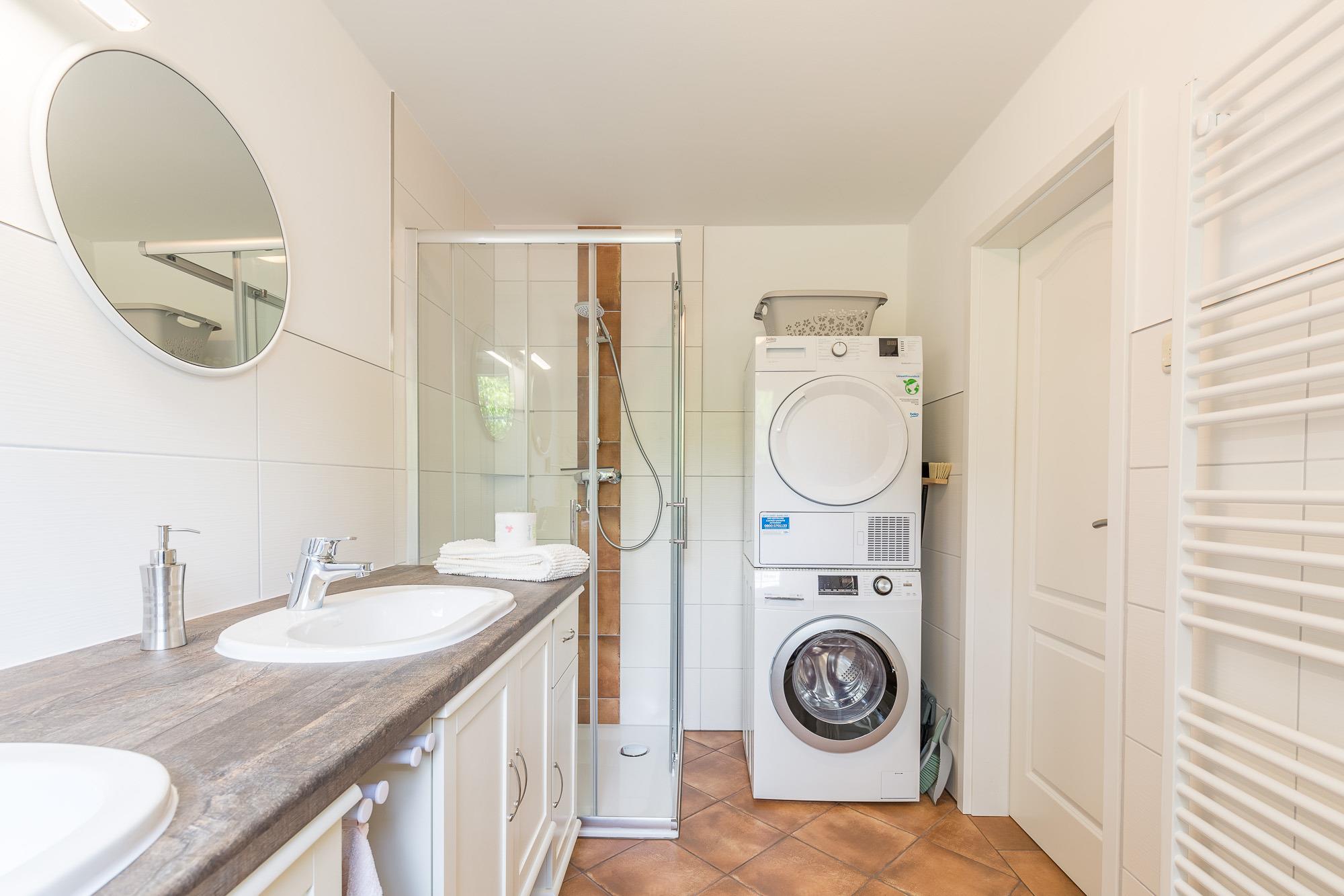 Ein 65 m² großes Wohn- und Esszimmer befindet sich im Erdgeschoss der Wohnung. Von hier aus geht es zu einer überdachten Terrasse. Im Erdgeschoss befindet sich außerdem eine Wohnküche und das Bad mit Dusche, Waschmaschine, Trockner und Fön.