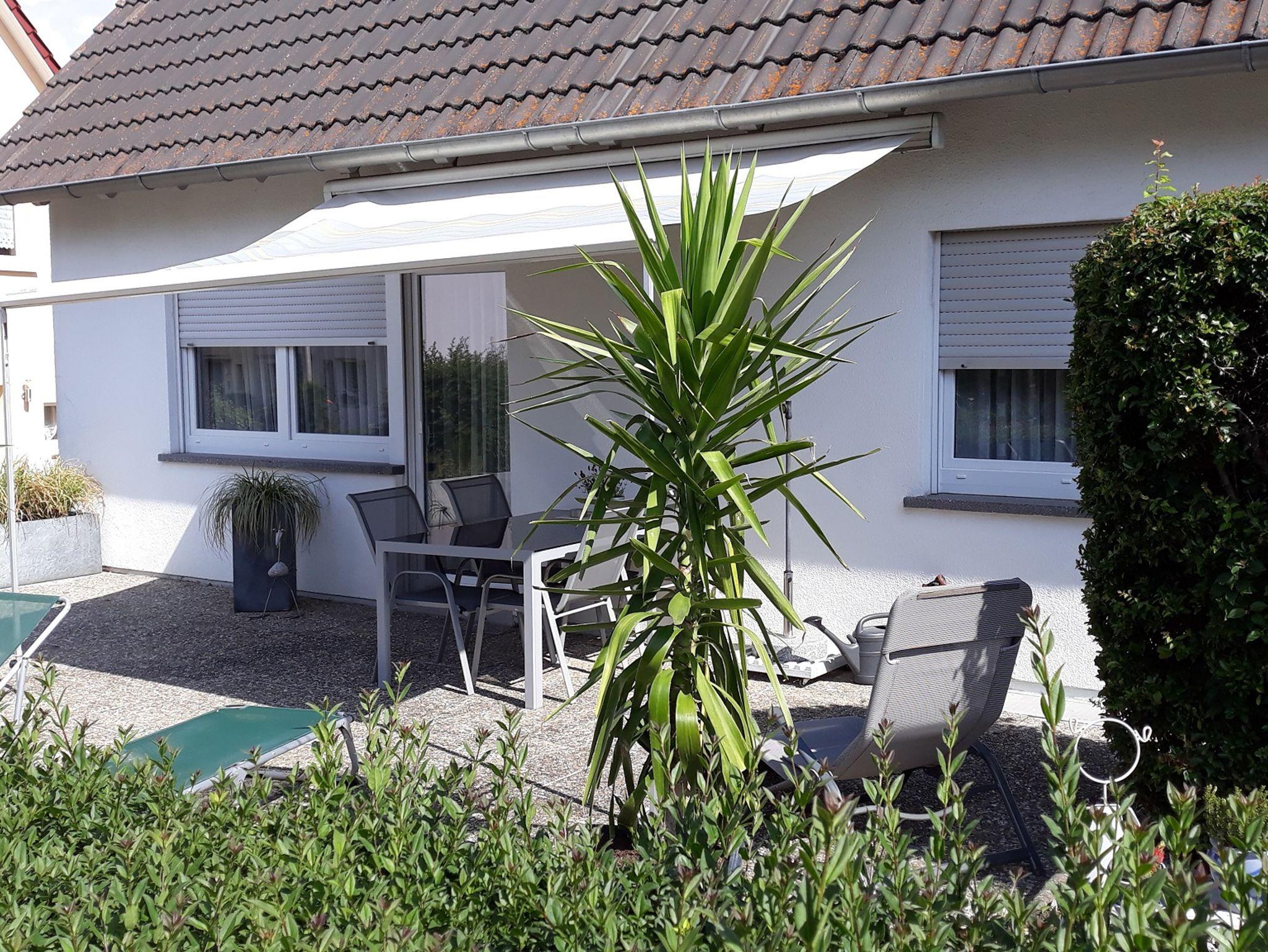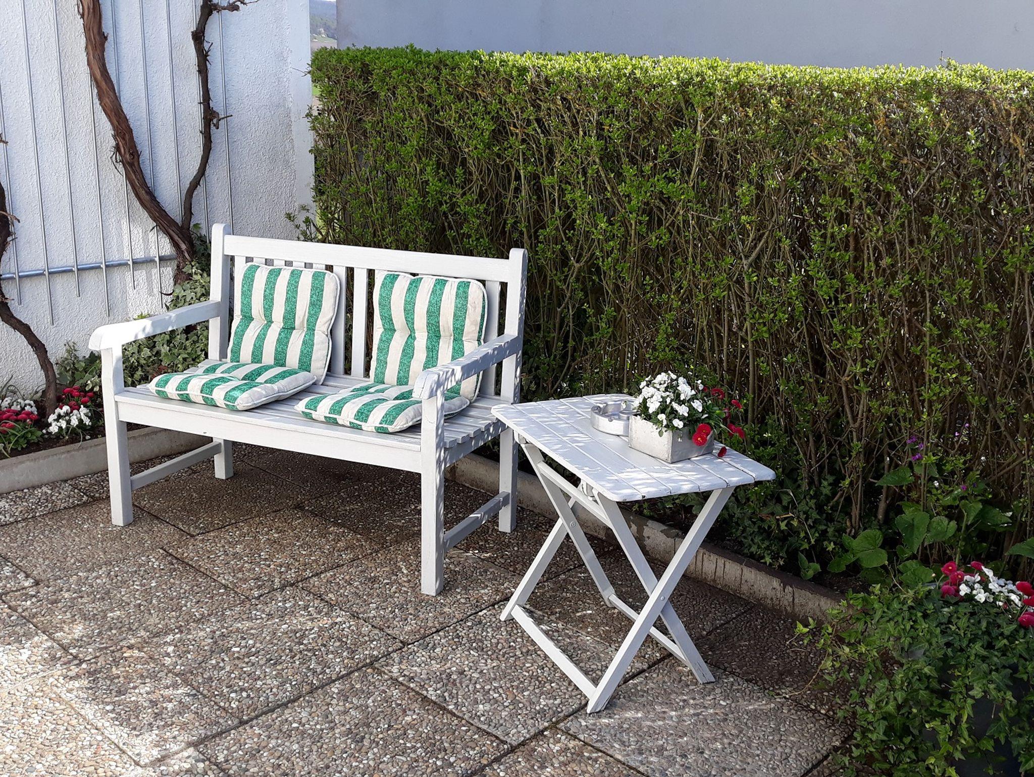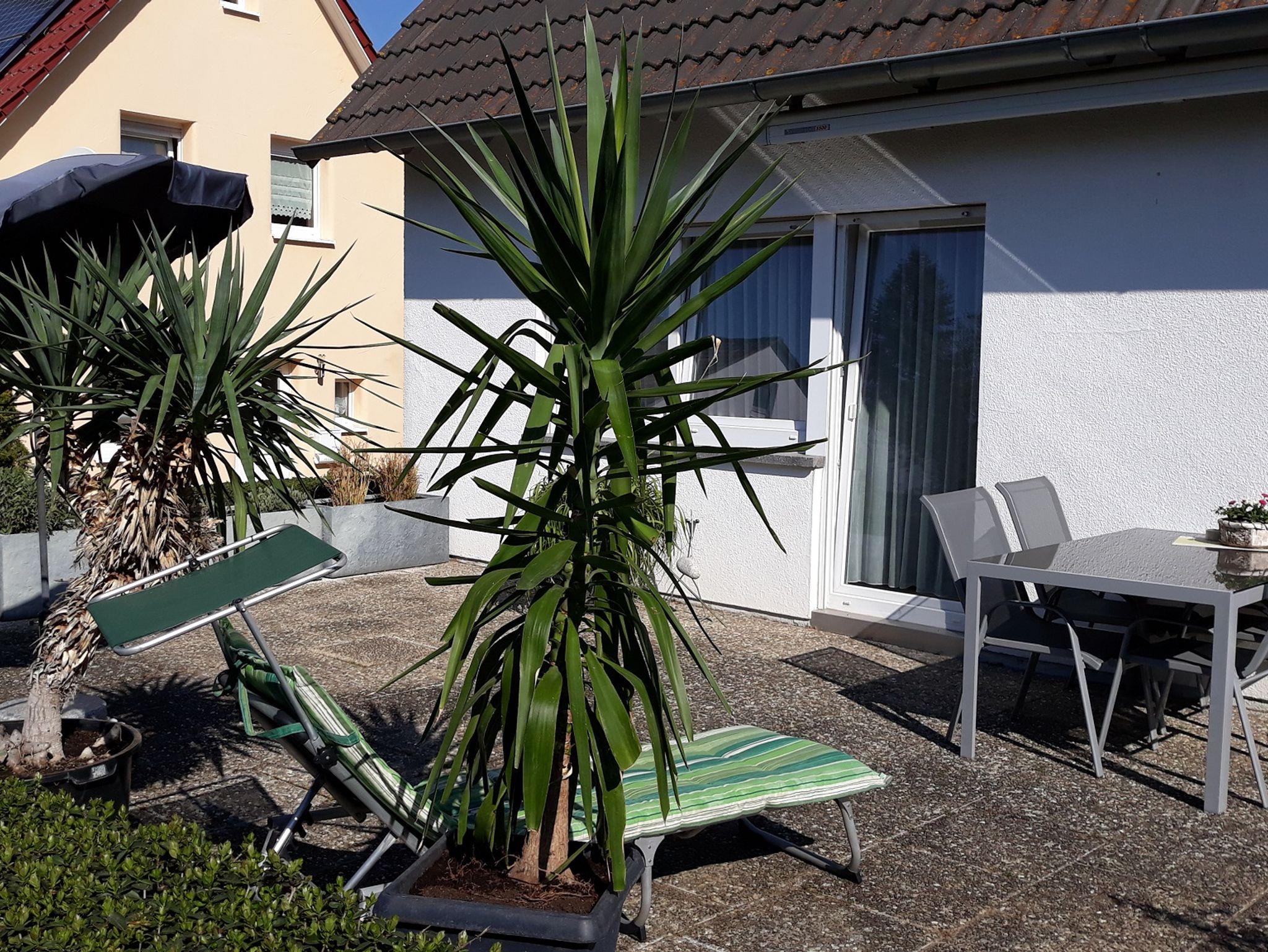 Die 65qm große Ferienwohnung liegt im Erdgeschoss und ist über eine Treppenstufe erreichbar. Die Nichtraucherwohnung bietet Platz für bis zu 4 Personen und verfügt über eine Wohnküche, ein Wohnzimmer, ein Schlafzimmer, ein Badezimmer sowie eine große Terrasse. Die Wohnküche ist mit Backofen, Kühlschrank, Mikrowelle, Toaster, Kaffeemaschine und Wasserkocher voll ausgestattet und bietet zudem eine Essecke. Das Wohnzimmer verfügt über ein Schlafsofa für 1-2 Personen sowie TV. Genauso gut lassen sich manche beruflichen Verpflichtungen einfach am Schreibtisch im Wohnzimmer erledigen. Einige Bücher und Spiele stehen zur Verfügung. Die 30qm große Terrasse mit Gartentisch und vier Stühlen ist vom Wohnzimmer aus begehbar. Das Schlafzimmer verfügt über ein Doppelbett mit getrennten Matratzen und offenem Fußende. Das Tageslichtbad verfügt über WC, Badewanne und Föhn. Bettwäsche, Geschirrtücher und Handtücher stehen Ihnen kostenfrei zur Verfügung. Zudem gibt es einen Abstellraum mit Waschmaschine sowie Putz- und Bügelzubehör. Sollten kleine Kinder mitreisen so stellen wir gerne zwei Kinderreisebetten und zwei Kinderhochstühle bereit. Die ganze Wohnung hat Außenrollos und Zentralheizung.