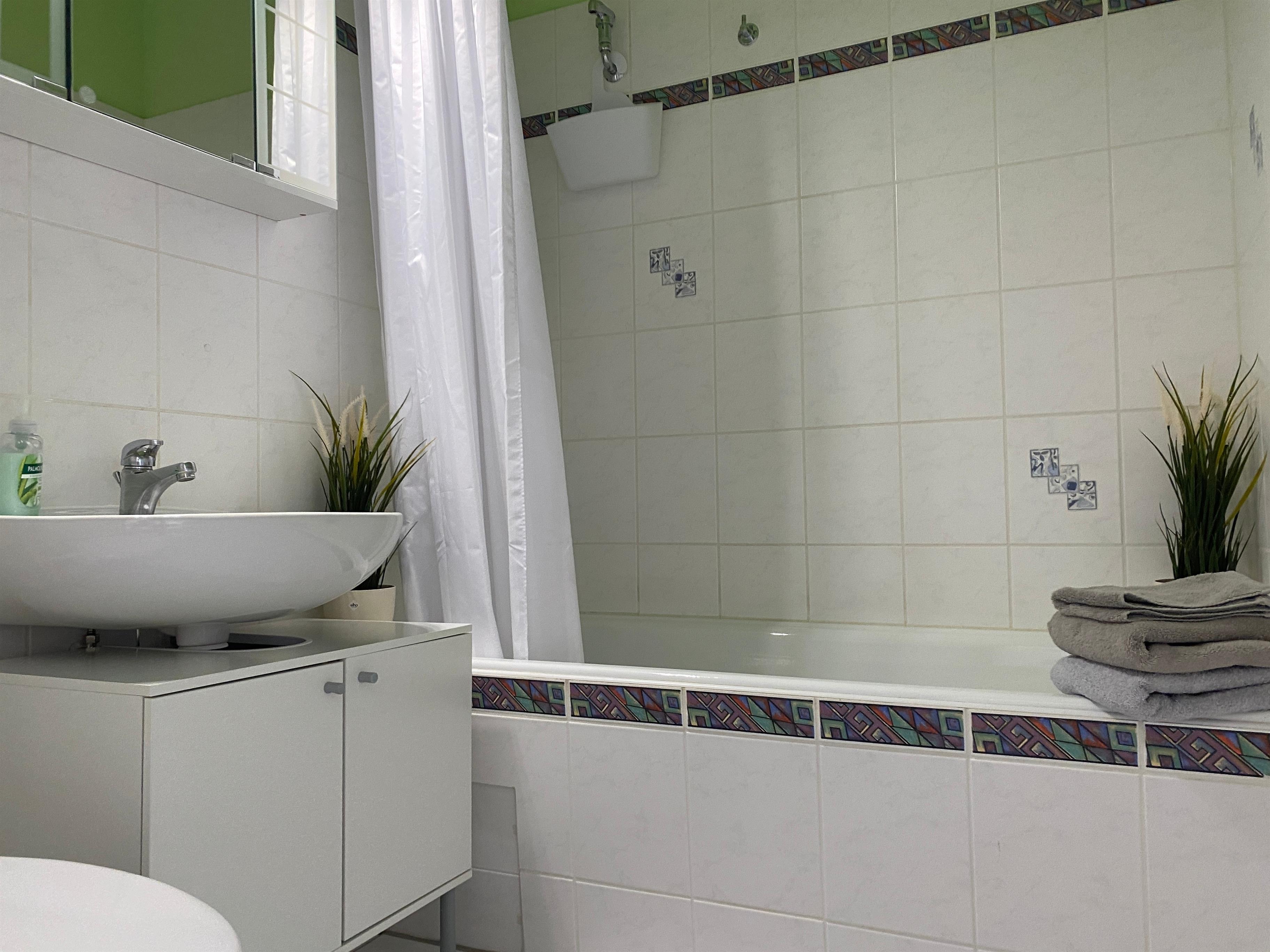 Das moderne helle Wannenbad verfügt über eine Badewanne, Waschtisch mit Spiegelschrank sowie WC, und Handtuchheizkörper.