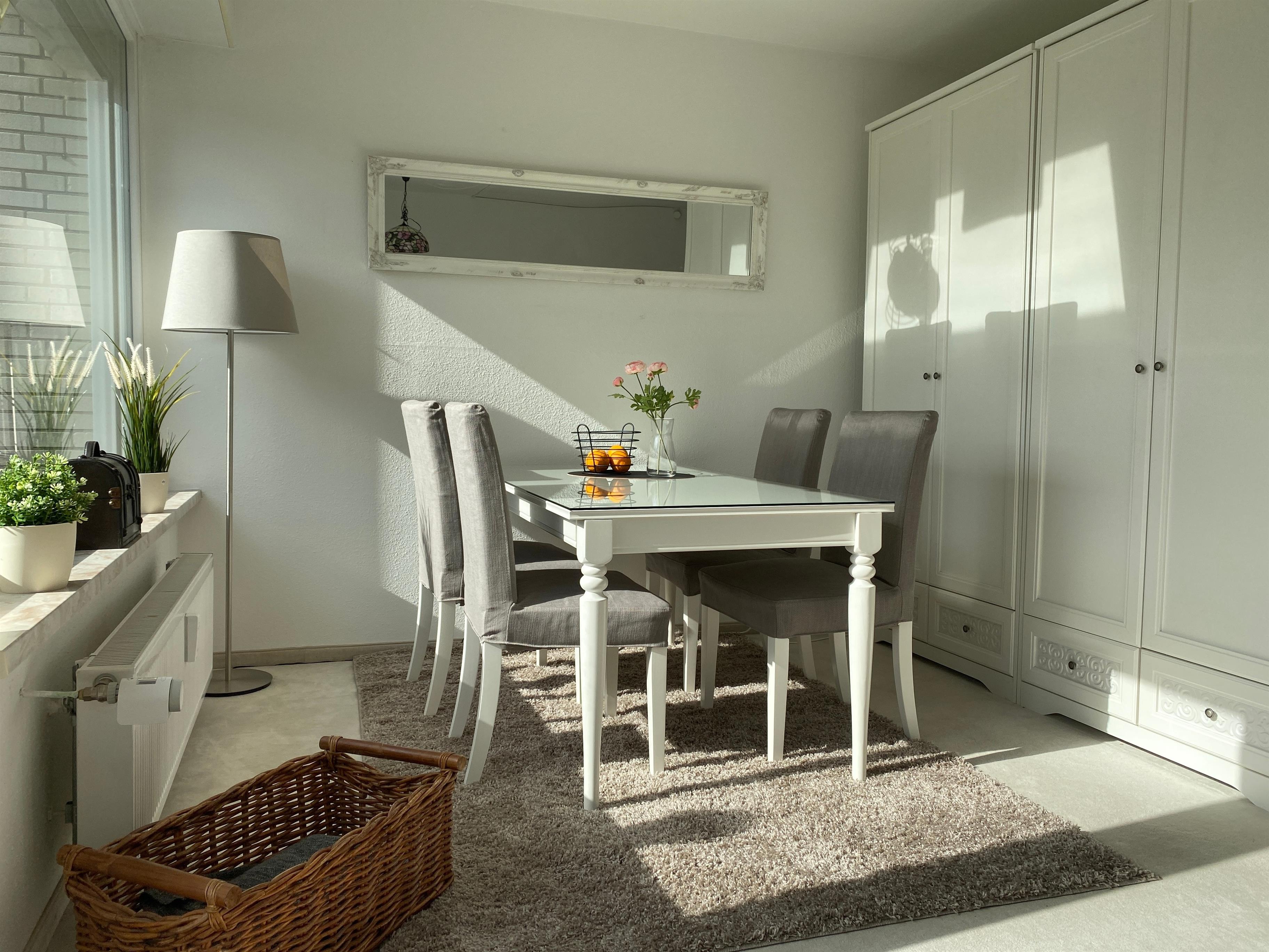 Das Wohn-Esszimmer verfügt über eine große gemütliche Couch, Flachbild-TV , einen schicken modernen Essplatz für 4 Personen sowie direktem Zugang zur ca. 35qm großen Terrasse mit freien Blick in die Natur. Hier steht eine Sitzgruppe und zwei Sonnenliegen zur Verfügung. Zwei großzüge Kleiderschränke sind vorhanden.