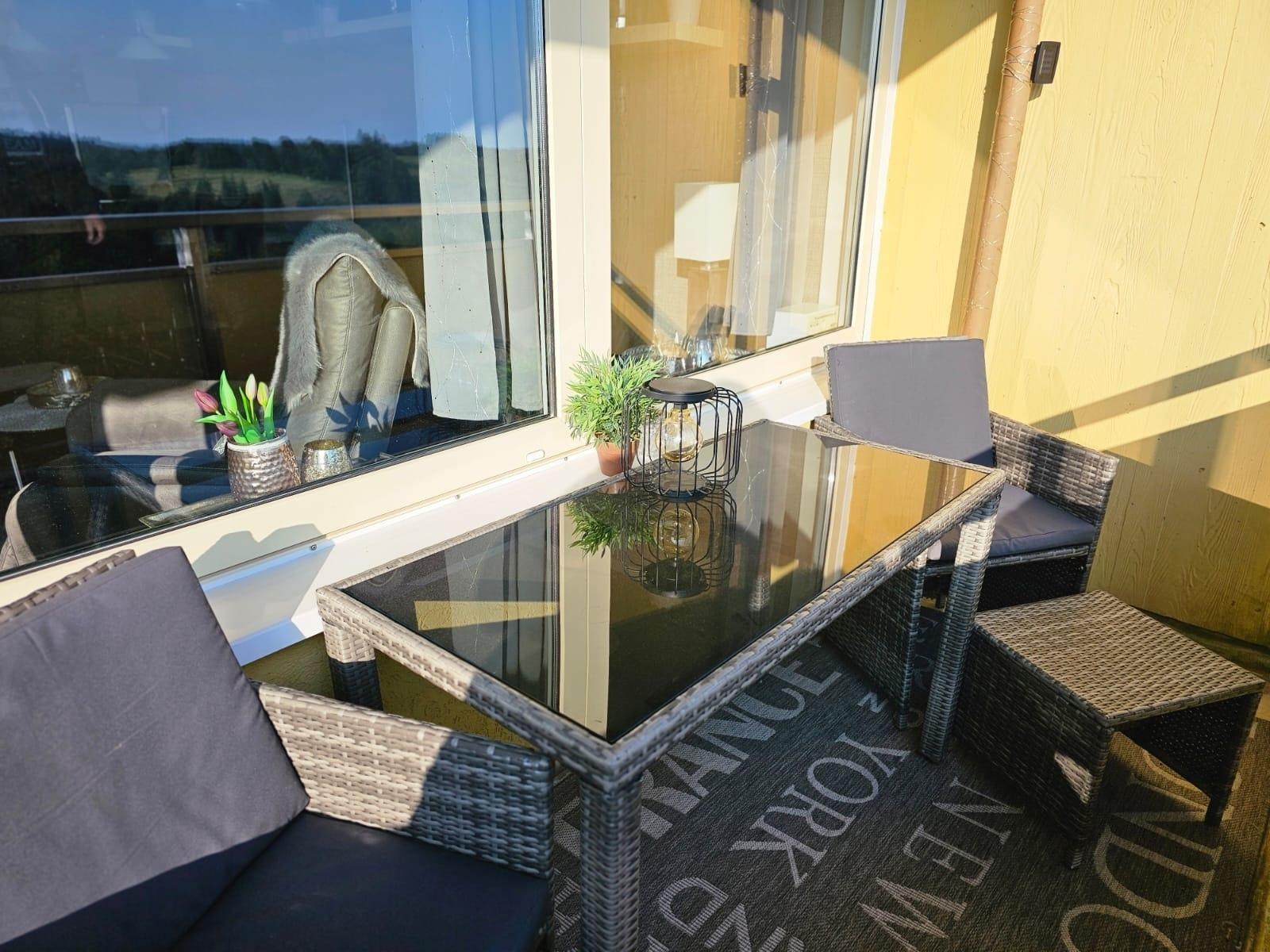 Auf dem Balkon mit den Sitzmöbeln können Sie die Sonne und den Ausblick genießen.
