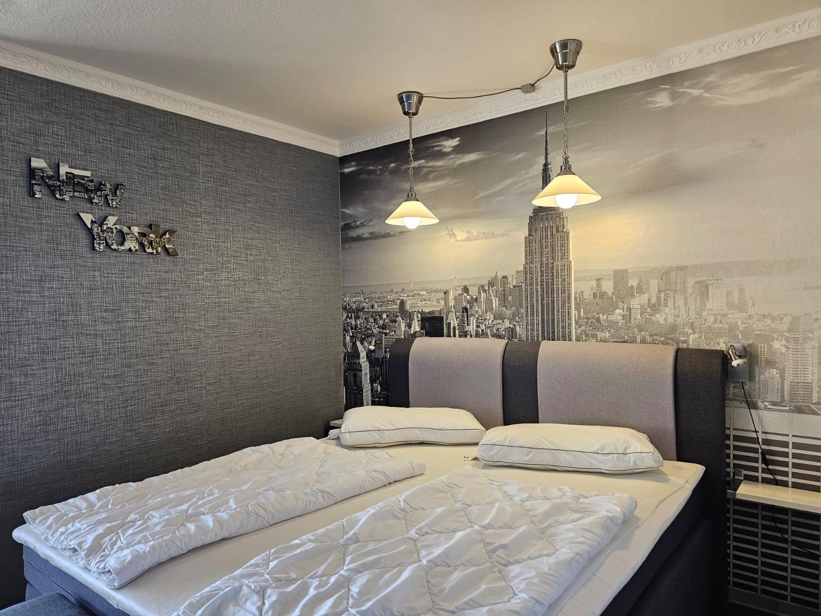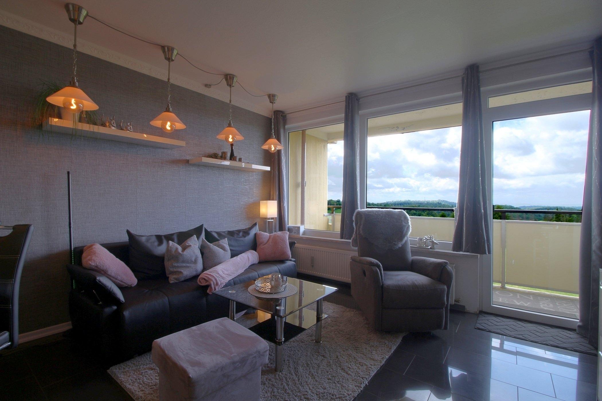 Geschmackvoll renovierte 2 Raum Ferienwohnung mit ungewöhnlicher Raumaufteilung im 7. OG nach Süden mit freiem Blick in die Wälder. Großzügiger Wohn- Schlafraum mit Doppelbett, Sitzgarnitur, Essbereich, hochwertigen Fliesen und schicker Einbauküche mit Geschirrspüler.