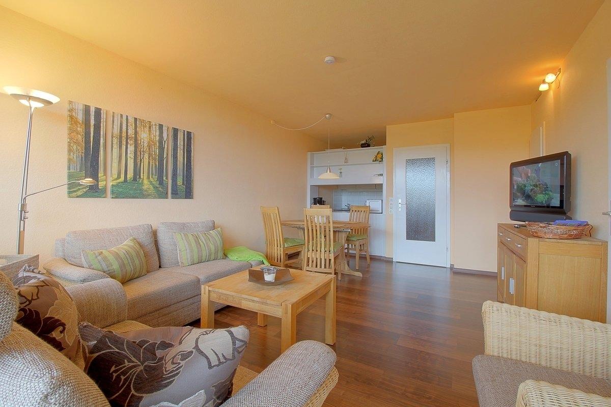 Komfortabel ausgestattete, Nichtraucher- Ferienwohnung mit einem Schlafraum mit Boxspringbett (1,80 x 2,00 m) und Stockbett für die Kinder im zweiten Schlafraum, schicke neue Küche mit Geschirrspüler, Essecke und Wohnraum mit bequemer Sitzgarnitur. Der Wohn-und Schlafbereich ist mit Laminatboden ausgestattet. Kostenloses W-Lan in der Wohnung vorhanden