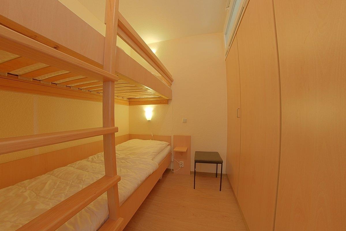 Komfortabel ausgestattete, Nichtraucher- Ferienwohnung mit einem Schlafraum mit Doppelbett (1,80 x 2,00 m) und Stockbett für die Kinder im zweiten Schlafraum, Küchenzeile mit Geschirrspüler, Essecke und Wohnraum. Der Wohn-und Schlafbereich ist mit PVC-Boden ausgestattet.