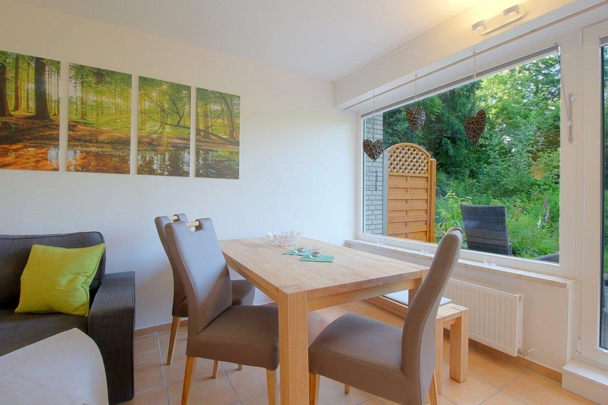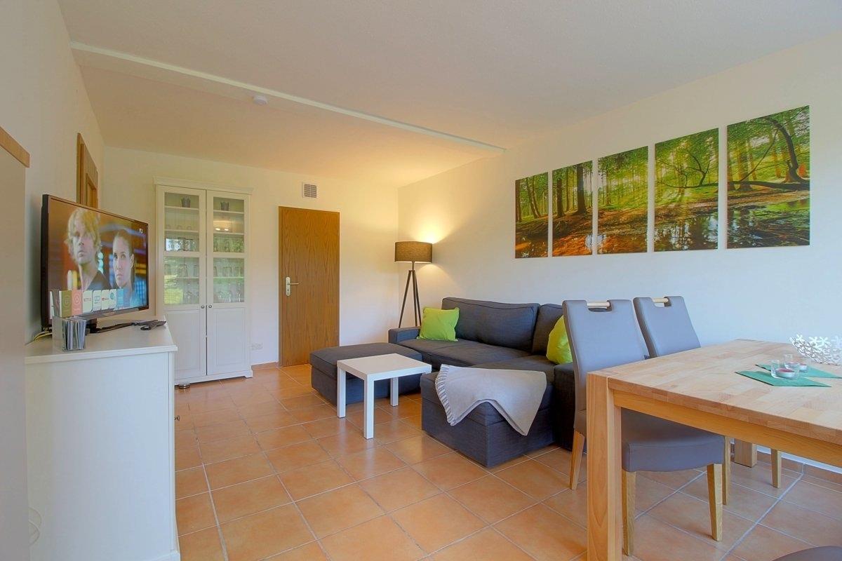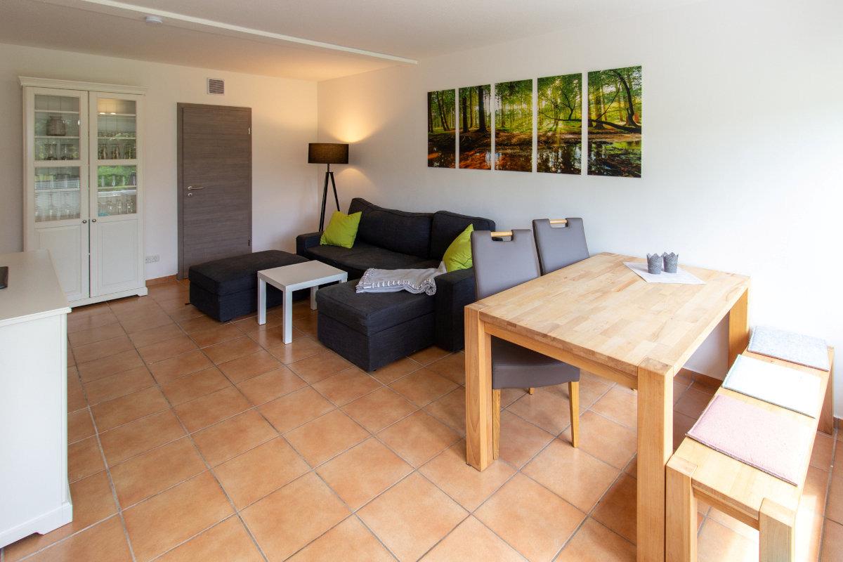Der Blick vom Wohnbereich in die Natur trägt zur Erholung bei. Die komplette Ferienwohnung ist mit Laminatboden ausgestattet. Im Wohnbereich steht eine Doppelschlafcouch zur Verfügung. Das Badezimmer hat ein Fenster und ist mit Badewanne inkl. Duschabtrennung ausgestattet.