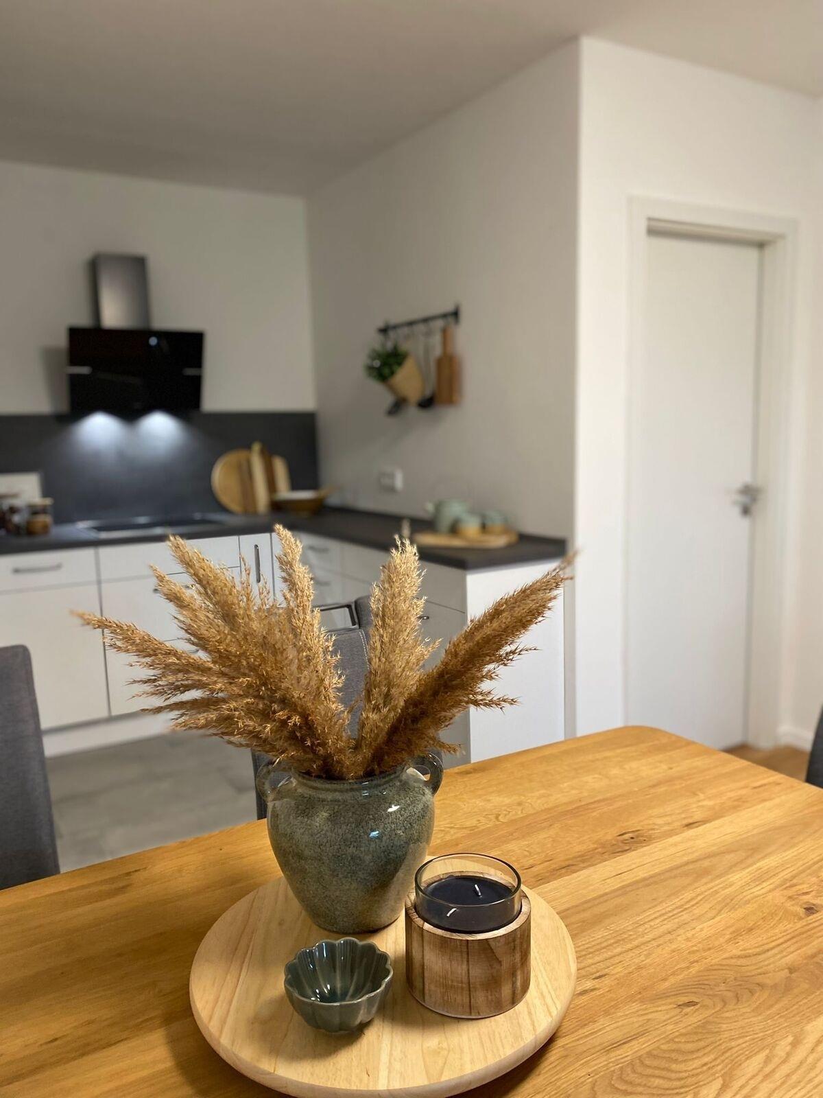 Schick eingerichtete Nichtraucher Ferienwohnung mit einem offenen Wohn- Ess- und Küchenbereich mit schicker Einbauküche mit Geschirrspüler.