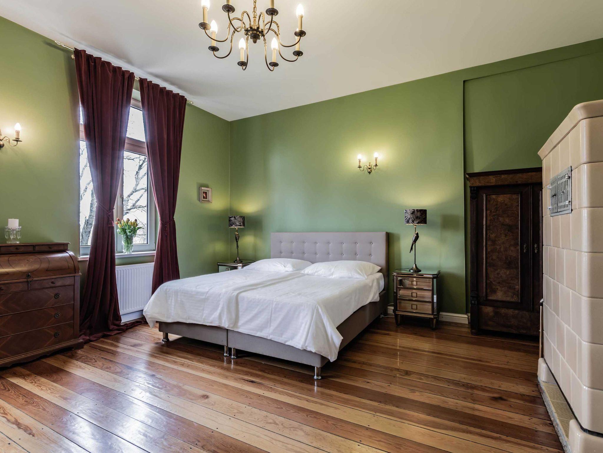 Die geräumigen Doppelzimmer befinden sich in der ersten Etage unseres Gutsschlosses. Stuckdecken, Kronenleuchter und das passende Ambiente sorgen dafür, dass Gäste sich wie auf Zeitreise fühlen.