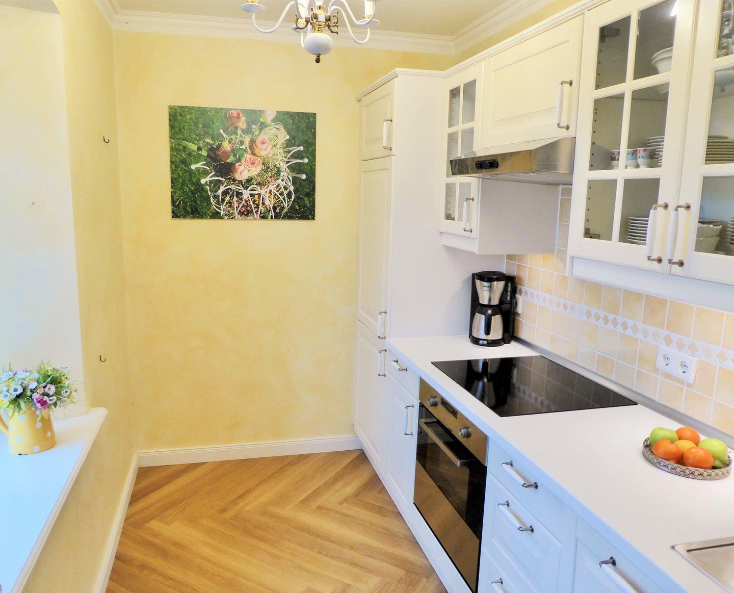 Die separate Küche beinhaltet eine voll ausgestattete Einbauküchenzeile mit 4-Zonen-Ceran-Kochfeld, Backofen, Dunstabzug, Mikrowelle, Geschirrspülmaschine, Kühlschrank mit Gefrierfach, Kaffeemaschine, Wasserkocher und Toaster. Die Küche ist mit Geschirr, Gläsern, Besteck und Töpfen bestens und vollständig ausgestattet.