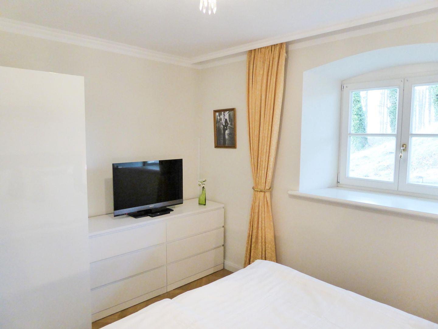Das gemütliche Schlafzimmer ist mit einem bequemen Doppelbett, Nachttischen sowie einem geräumigen Kleiderschrank eingerichtet – hier steht Ihnen auch ein zusätzliches modernes TV-Gerät zur Verfügung. Eine zusätzliche bequeme Schlafmöglichkeit für eine weitere 3. oder 4. Person bietet die ausziehbare Schlafcouch im Wohnzimmer.