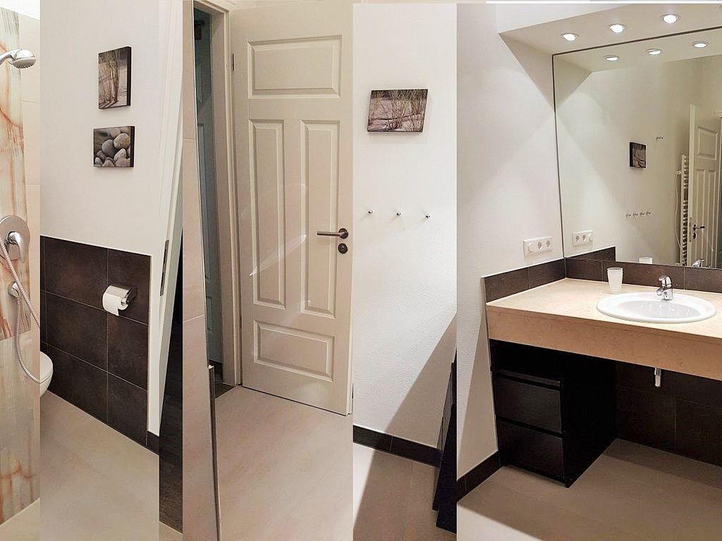 Das moderne Badezimmer verfügt über eine begehbare, ebenerdige und somit auch seniorenfreundliche Dusche, einen Waschtisch mit großem Wandspiegel, Kosmetikspiegel, WC, Handtuch-Heizkörper, Föhn sowie ausreichend Ablagemöglichkeiten.