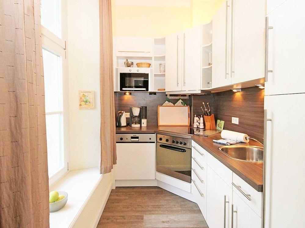 Die separate Küche beinhaltet eine voll ausgestattete Einbauküchenzeile mit 4-Zonen-Ceran-Kochfeld, Backofen, Dunstabzug, Geschirrspülmaschine, Kühlschrank mit Gefrierfach, Kaffeemaschine, Wasserkocher und Toaster. Die Küche ist mit Geschirr, Gläsern, Besteck und Töpfen bestens und vollständig ausgestattet.