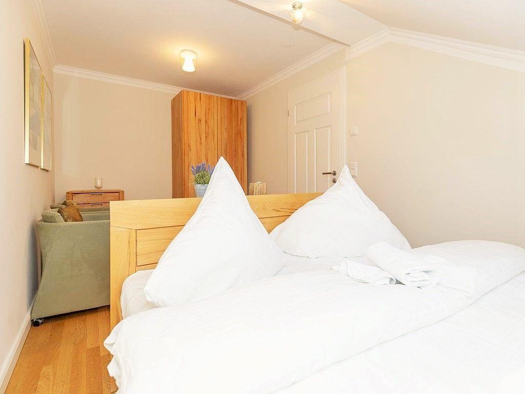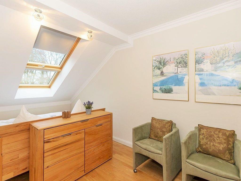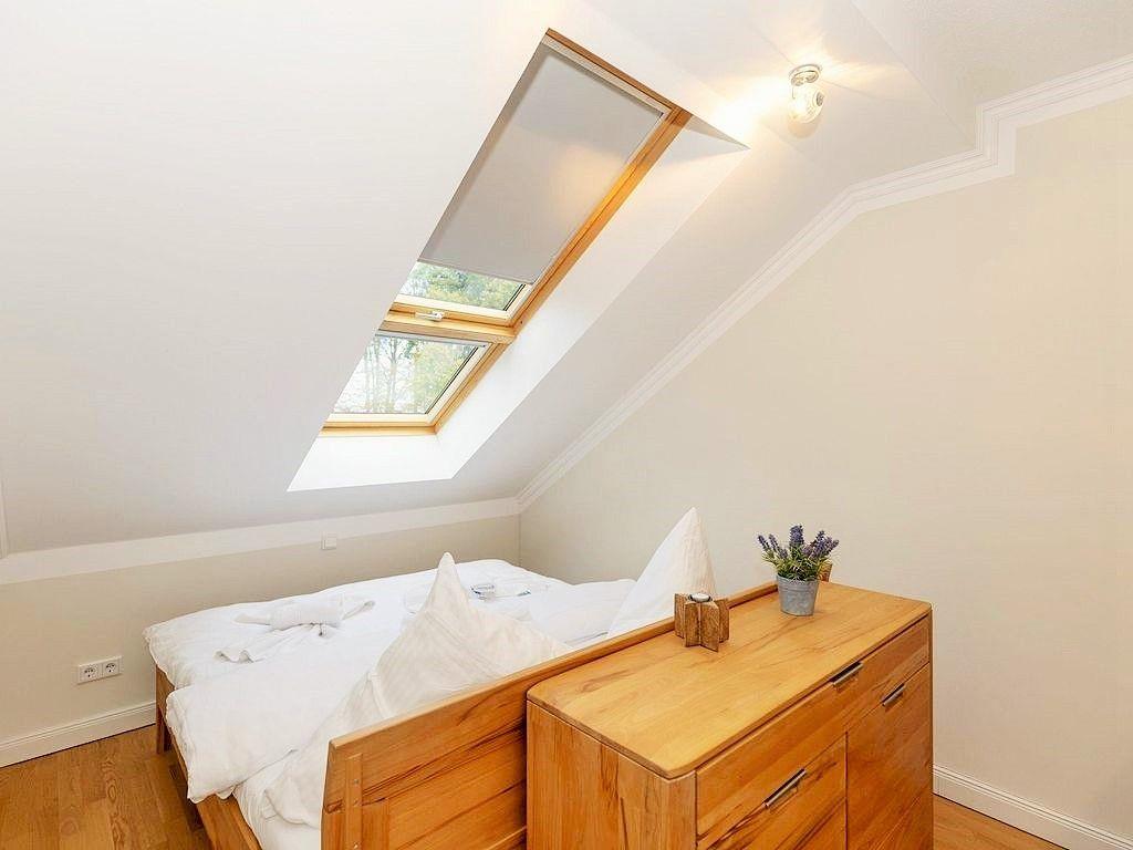 Das freundliche und separate 2. Schlafzimmer verfügt ebenfalls über ein bequemes Doppelbett, 2 Kommoden, einen Kleiderschrank sowie 2 Sessel. Durch das große Dachflächenfenster direkt über dem Bett können Sie wunderbar den nächtlichen Himmel über Ihnen beobachten und träumen …!