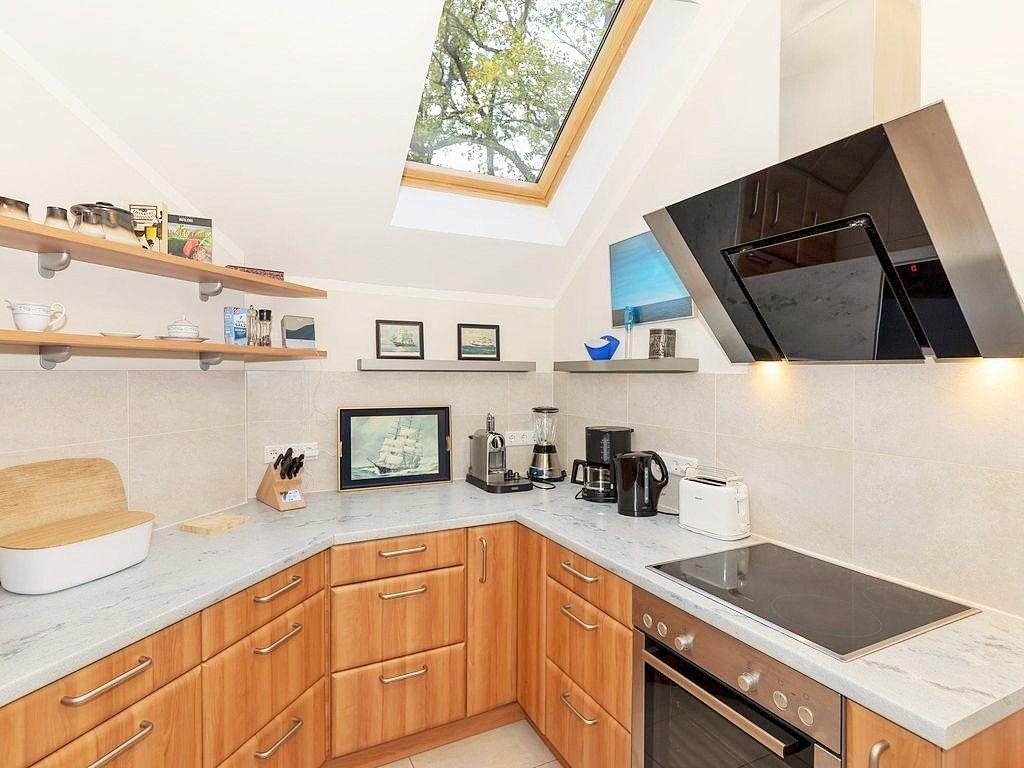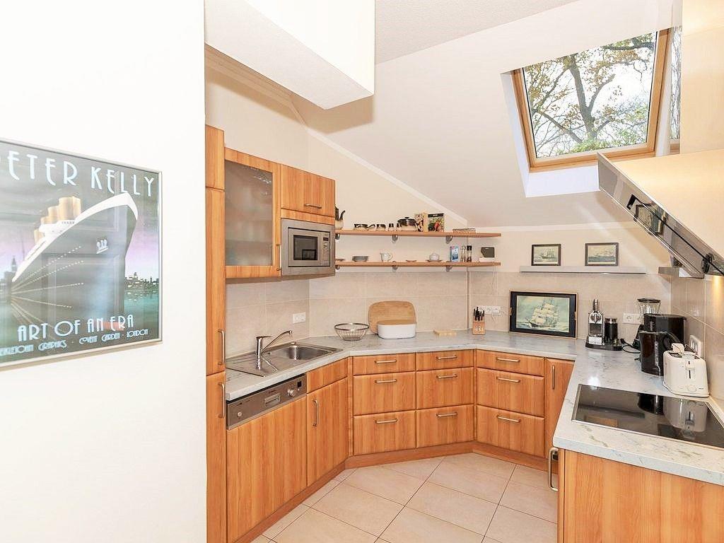 Die separate Küche beinhaltet eine voll ausgestattete Einbauküchenzeile mit 4-Zonen-Ceran-Kochfeld, Backofen, Dunstabzug, Mikrowelle, Kühlschrank und separaten Gefrierschrank, Geschirrspülmaschine, Kaffeemaschine, Wasserkocher und Toaster. Die Küche ist mit Geschirr, Gläsern, Besteck und Töpfen bestens und vollständig ausgestattet.
