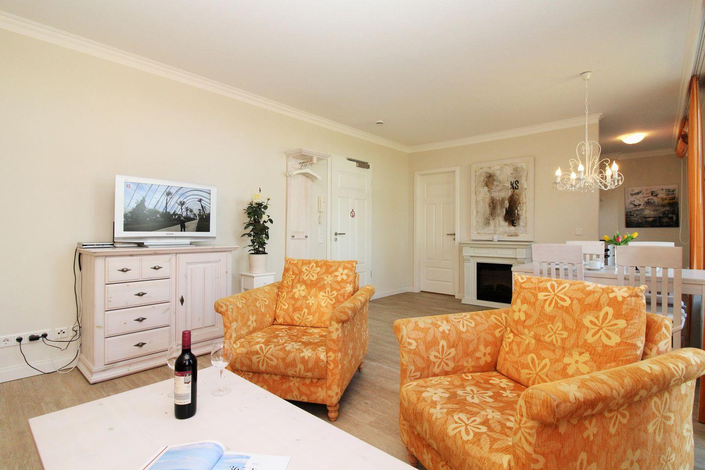 Das geräumige und gemütliche Wohn-/Esszimmer verfügt über eine separate Sitzgruppe mit bequemer (Schlaf-)Couch, 2 Sessel, Couchtisch, einen separaten Esstisch mit 4 Stühlen sowie ein Sideboard. Vom Wohnzimmer aus haben Sie direkten Zugang zu dem ca. 10 m² großen Balkon (nach Nord-Osten ausgerichtet) mit Balkonmöbeln. Hier sitzen Sie entspannt und gemütlich mit herrlichem Blick in den Schloßpark und können abends bei einem guten Glas Wein in Ruhe die lauen Sommernächte genießen!