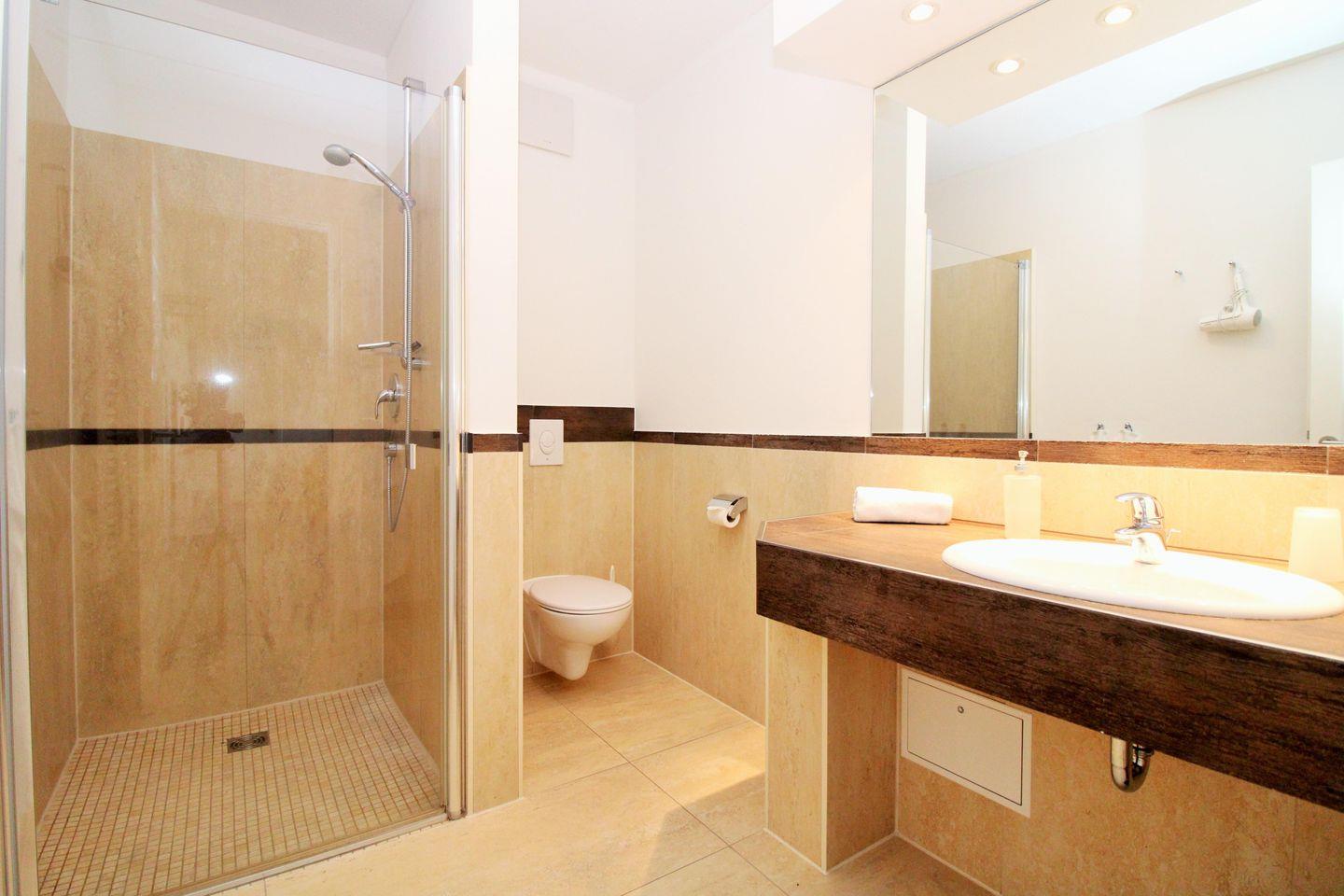 Das moderne Badezimmer verfügt über eine begehbare, ebenerdige und somit auch seniorenfreundliche Dusche, einen Waschtisch mit großem Wandspiegel, WC, Handtuch-Heizkörper sowie ausreichend Ablagemöglichkeiten.