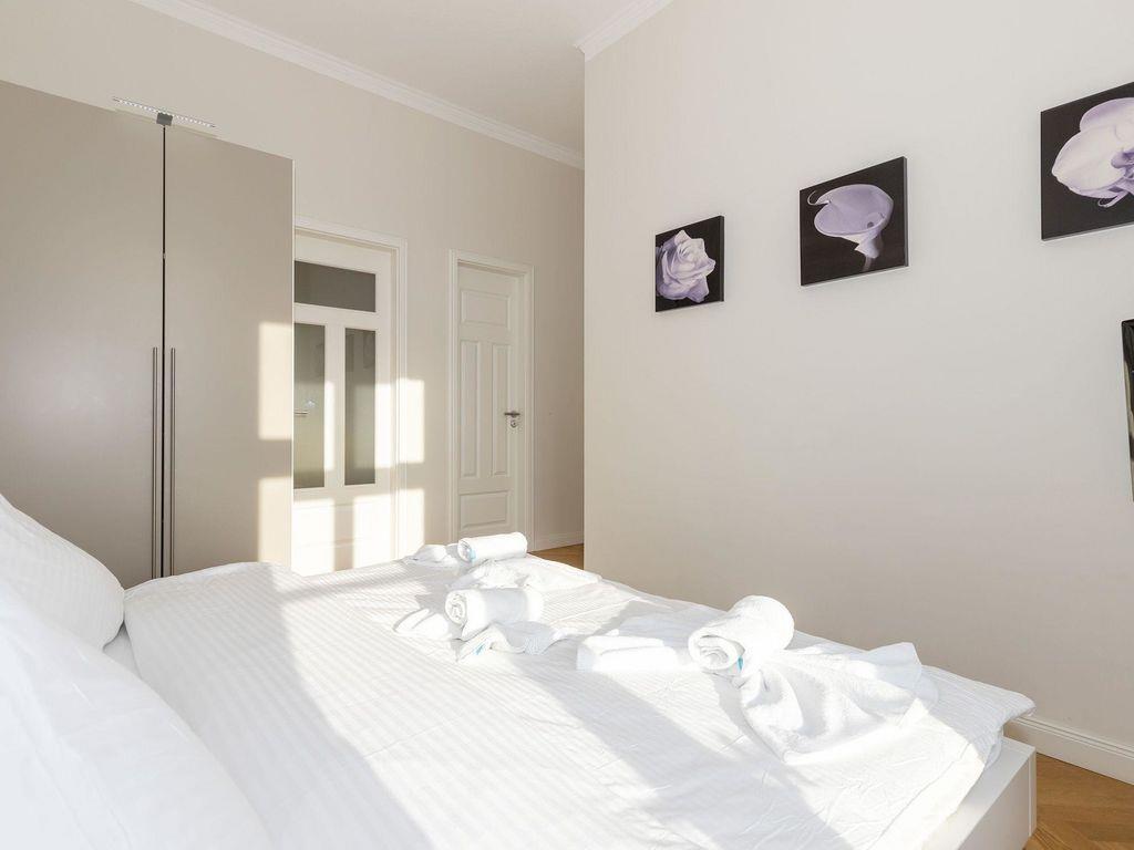 Die exklusive und sehr geräumige 3-Zimmer-Wohnung (ca. 92 m²) im 1. Obergeschoss (Beletage) besitzt ein hohes Maß an Funktionalität und ist komplett eingerichtet. Der Bodenbelag in den Wohn- und Schlafräumen ist hochwertiges Eichen-Parkett, die Küche und die Bäder / WCs sind gefliest. Alle Räume sind mit Fußbodenheizung ausgestattet.