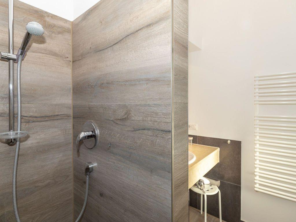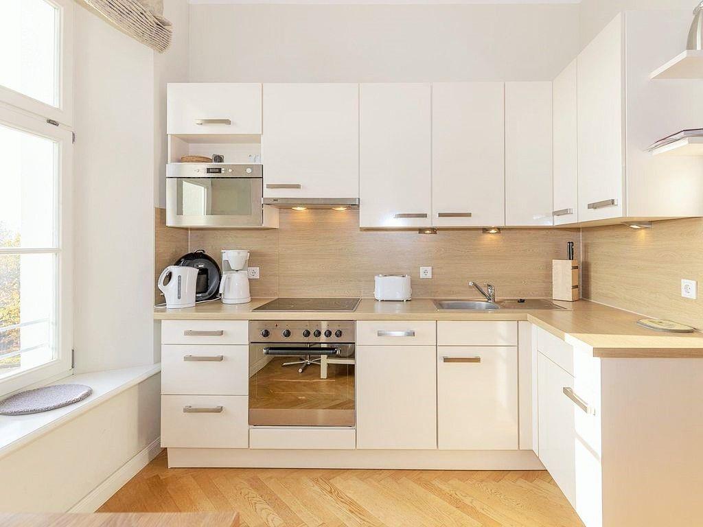 Die offene Küche beinhaltet eine voll ausgestattete Einbauküchenzeile mit 4-Zonen-Ceran-Kochfeld, Backofen, Dunstabzug, Elektrogrill, Mikrowelle, Kühlschrank mit Gefrierfach, Geschirrspülmaschine, Kaffeemaschine, Nespresso-Maschine, Wasserkocher und Toaster. Die Küche ist mit Geschirr, Gläsern, Besteck und Töpfen bestens und vollständig ausgestattet. Für den kleinen Snack zwischendurch verfügt die Küche über einen zusätzlichen Esstisch mit 2 Barhockern.