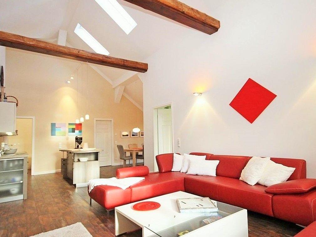 Das exklusive und großzügige Wohn-/Esszimmer mit offener Decke und Blick auf das beleuchtete Dachgebälk verfügt über eine große Sitzgruppe mit bequemer Leder-Couch, Liege und Couchtisch, einen separaten Esstisch mit 6 Stühlen sowie ein großes Sideboard. Vom Essbereich aus haben Sie direkten Zugang zu dem ca. 8 m² großen Balkon (nach Süd-Osten ausgerichtet) mit bequemen Balkonmöbeln. Hier sitzen Sie entspannt und gemütlich mit traumhaftem und weitem Blick in die herrliche Parkanlage sowie die weite Landschaft der Umgebung und können abends bei einem guten Glas Wein in Ruhe die lauen Sommernächte genießen! Aus den 3 Fenstern der südlichen Giebelseite können Sie das Salzhaff bei Rerik und bei klarer Sicht sogar bis nach Wismar sehen!