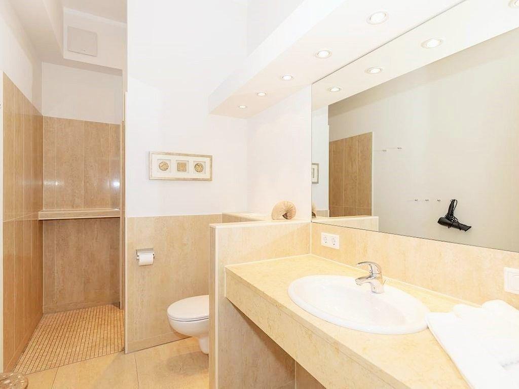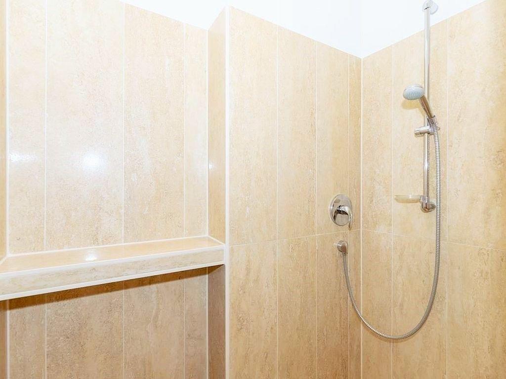 Das moderne Badezimmer verfügt über eine begehbare, ebenerdige und somit auch seniorenfreundliche Dusche, einen Waschtisch mit großem Wandspiegel, WC, Handtuch-Heizkörper, Föhn sowie ausreichend Ablagemöglichkeiten.
