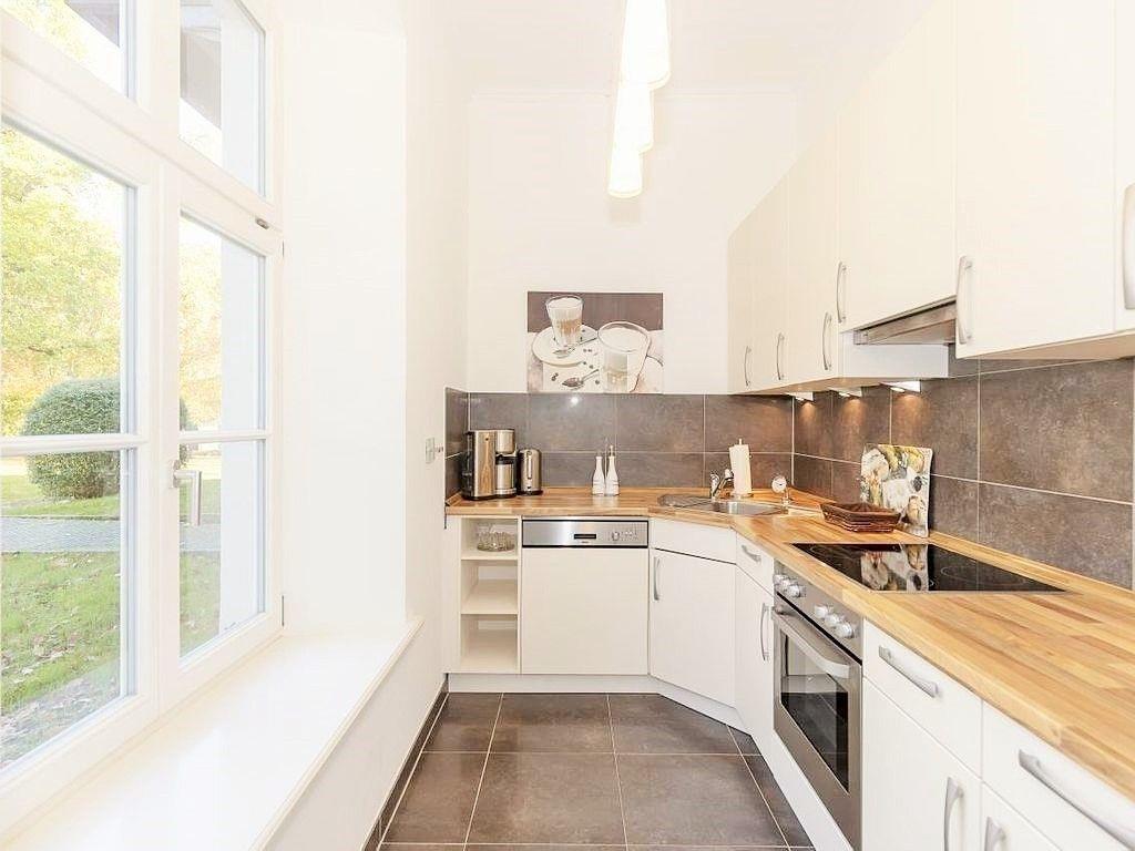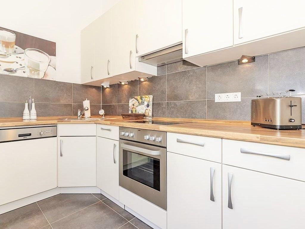 Die separate Küche beinhaltet eine voll ausgestattete Einbauküchenzeile mit 4-Zonen-Ceran-Kochfeld, Backofen, Dunstabzug, Kühlschrank mit Gefrierfach, Geschirrspülmaschine, Kaffeemaschine, Wasserkocher und Toaster. Die Küche ist mit Geschirr, Gläsern, Besteck und Töpfen bestens und vollständig ausgestattet.