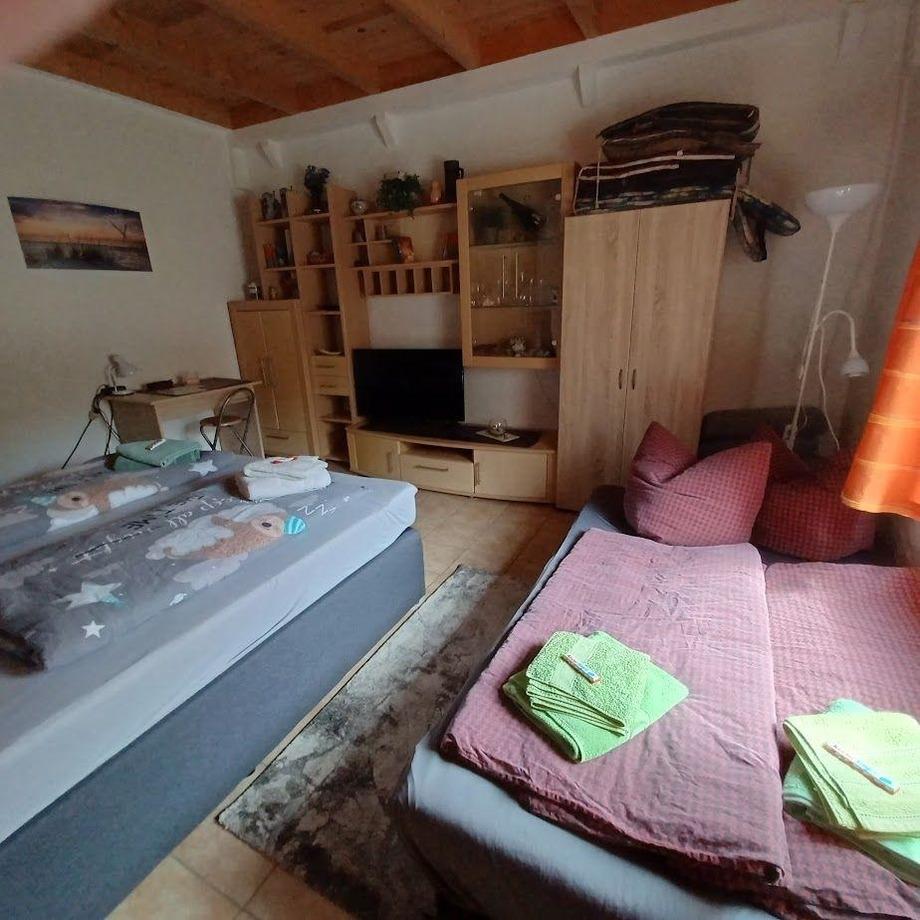 Ein Bad mit Dusche und WC sowie ein Wohnzimmer mit Kaminofen, TV, Netflix etc., Couch (geeignet als Schlafmöglichkeit für zwei Personen) sowie Zugang zur Terasse und Garten.