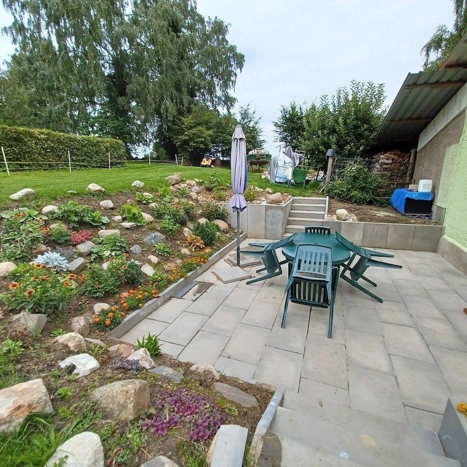 Ferienhaus mit Wohnzimmer mit evtl. Aufbettung, gr. Schlafzimmer, Küche mit Eßtisch, Bad und große Terasse. Kaminofen. WLAN, Netflix, Bettwäsche u. Handtücher kostenfrei.