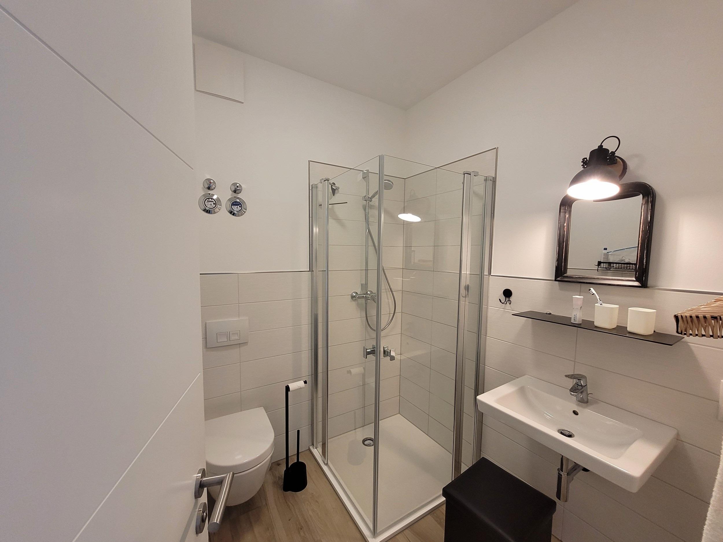 - Badezimmer mit Dusche/WC, Waschbecken und Spiegelschrank, u,a. Fön