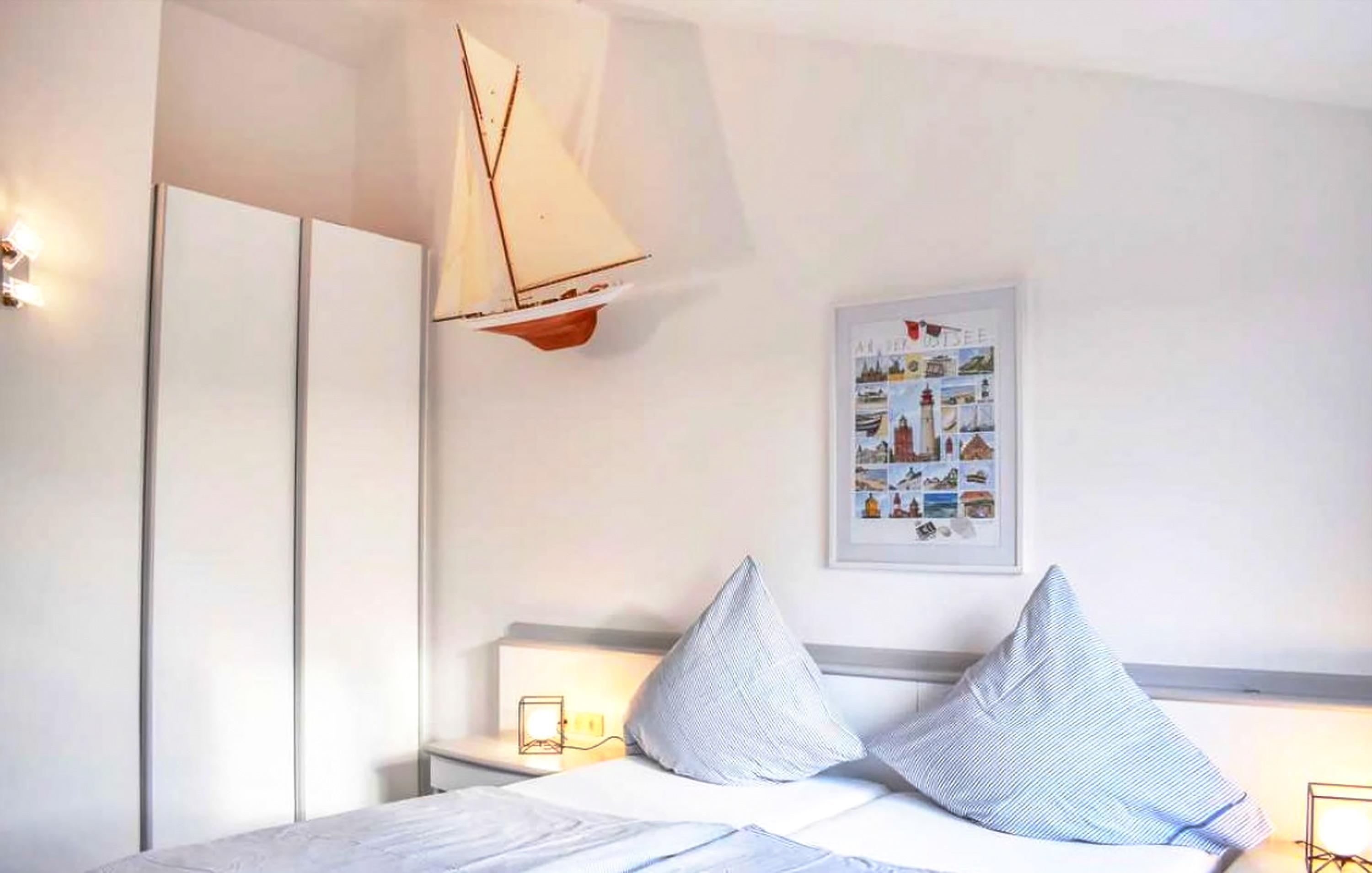 Dort liegen die beiden Schlafzimmer mit bequemen 180x200 Doppelbetten. Von hieraus hat man einen unverbauten Blick über die Felder bis zur Ostsee. In einem der Schlafzimmer befindet sich ein zusätzliches Schlafsofa. Auf dieser Ebene steht auch ein weiteres Dusch-/Wannenbad mit Waschbecken, WC und Wand-Fön zur Verfügung.