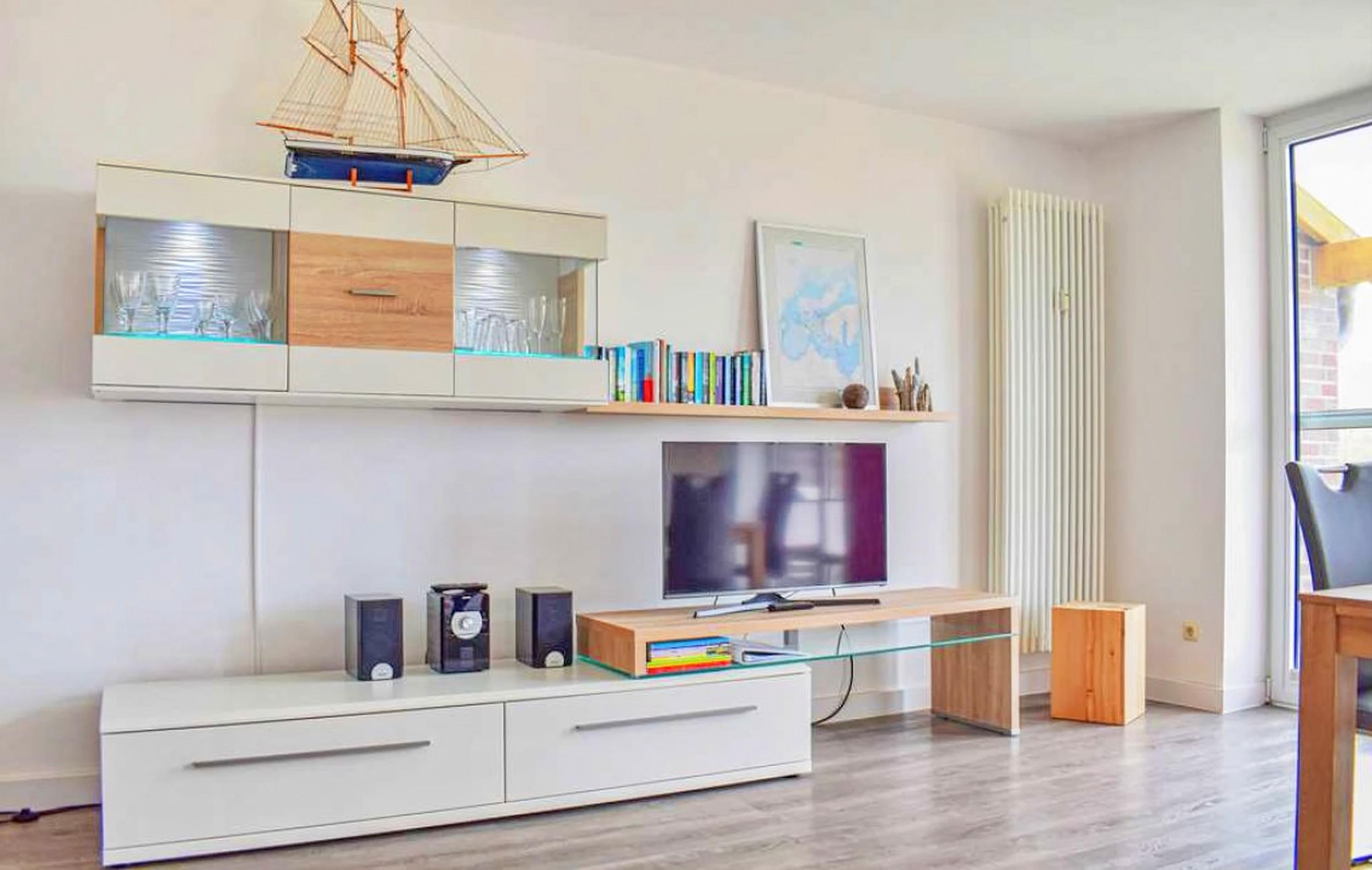 - Wohnzimmer mit 2 Sofas, Essbereich für 5 Personen, Anbauwand mit TV (Sat) + Musikanlage (Radio und CD)
